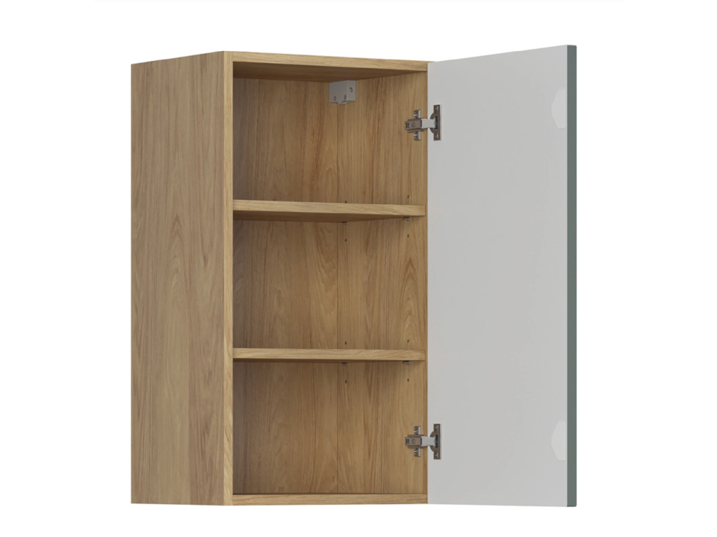 Horní skříňka Iris je ideálním místem pro uložení talířů, misek, šálků nebo zásob sypkých produktů a koření. Uvnitř nábytku naleznete praktickou polici, která vám pomůže efektivně uspořádat uložené předměty a snadno se v nich orientovat.