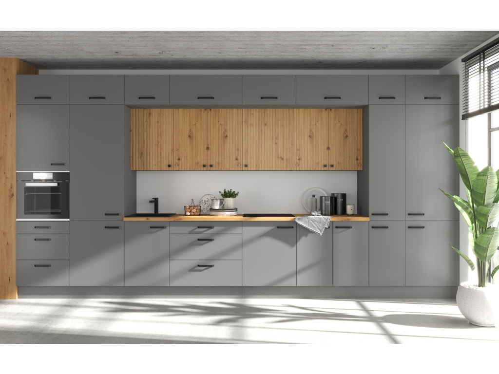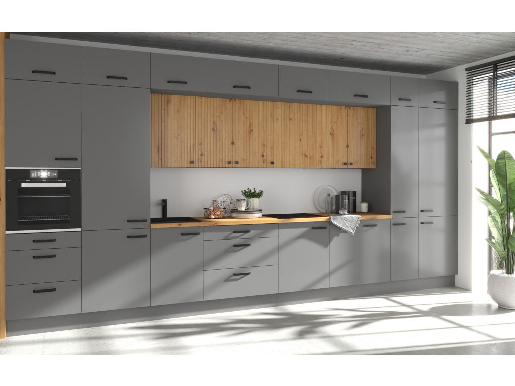Horní kuchyňská skříňka NESSA ANT o šířce 30 cm a výšce 107,5 cm je otevřený úložný prvek bez dvířek, ideální pro vystavení dekorací nebo snadno přístupné uložení každodenních potřeb. Vyrobena z odolné laminované desky o tloušťce 16 mm v elegantním antracitovém dekoru, skvěle ladí s moderním kuchyňským interiérem. Hrany jsou opatřeny melaminem pro zvýšenou životnost a odolnost. NESSA ANT 30 G-90 OTW je praktickým i estetickým doplňkem kuchyňské sestavy.