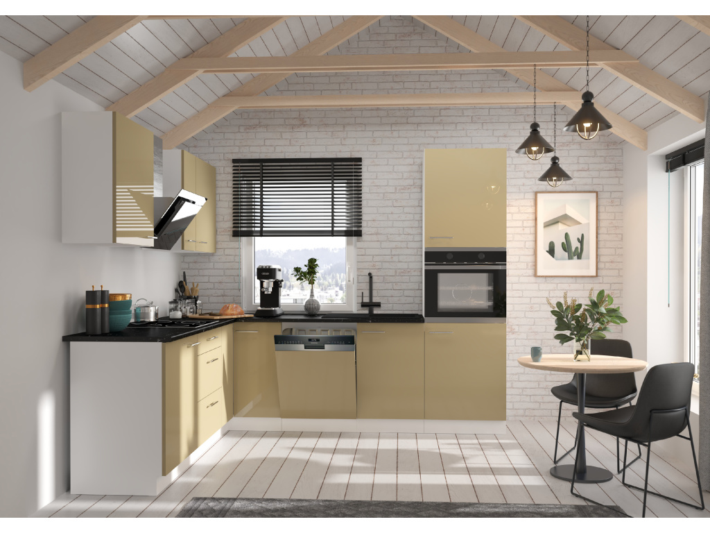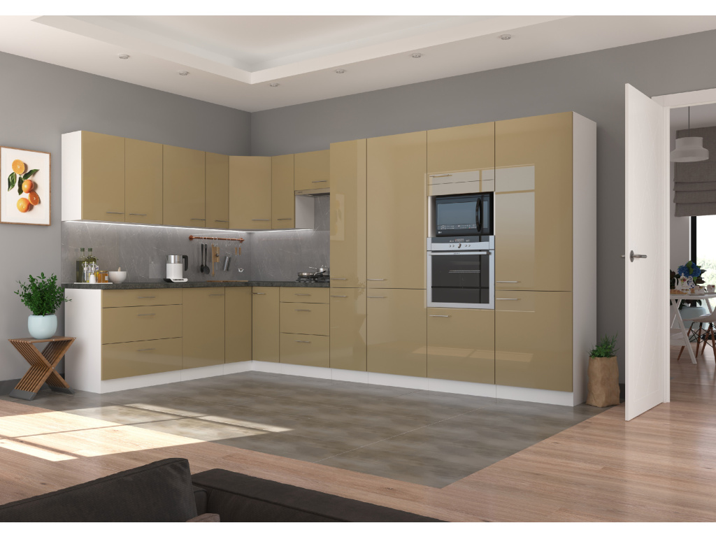Rohová horní kuchyňská skříňka z kolekce LARA s výklopným dvířkem otevíraným pod úhlem 45° a výškou 90 cm nabízí maximální využití rohového prostoru v kuchyni. Díky svému praktickému provedení umožňuje snadný přístup k uloženým věcem i v méně přístupných částech kuchyňské linky. Čelo skříňky je vyrobeno z kvalitního materiálu s odolnou ABS hranou a dostupné ve třech elegantních lesklých variantách – cappuccino, šedý a bílý lesk. Bílý laminovaný korpus je navržen pro dlouhou životnost a snadnou údržbu. Mechanismus výklopných dvířek je vybaven tlumeným dovíráním, které zajišťuje tiché a plynulé zavírání. Kovová úchytka v lesklém chromu s roztečí 128 mm doplňuje moderní vzhled skříňky. Tento model je perfektní volbou pro funkční a estetické využití horního rohu kuchyně.