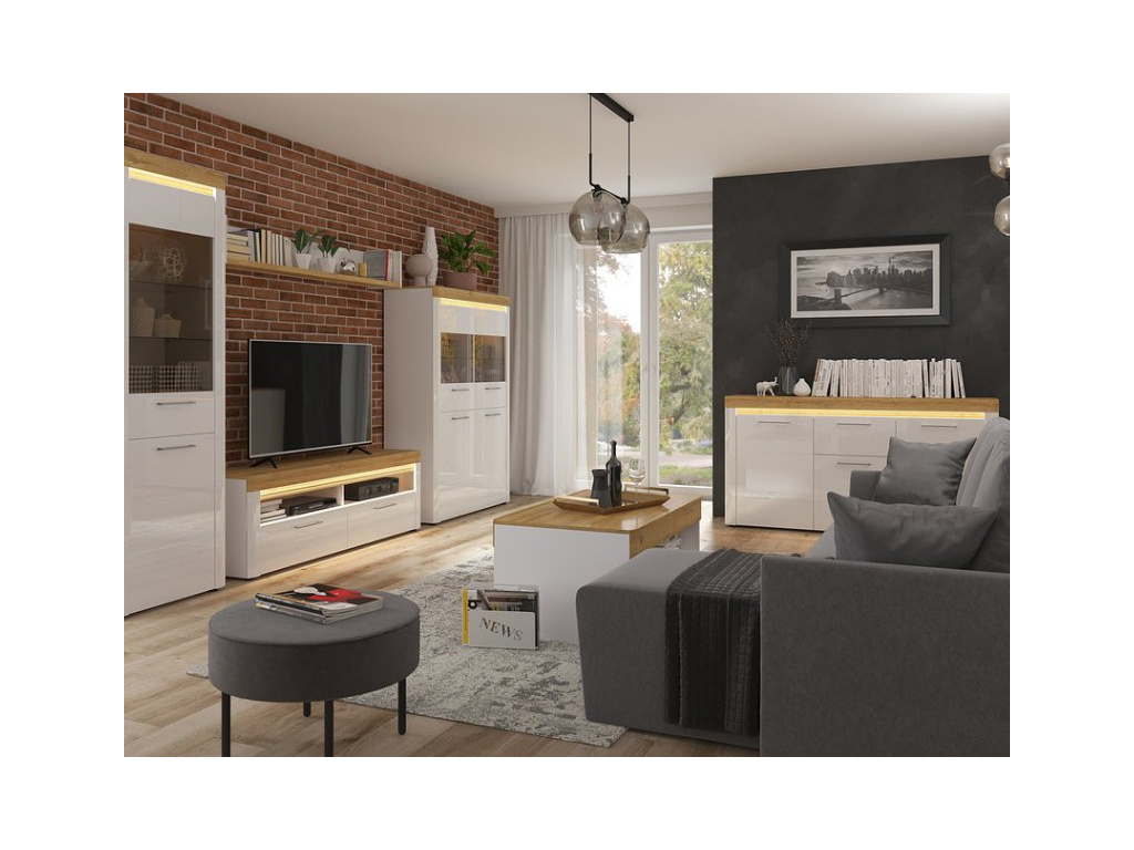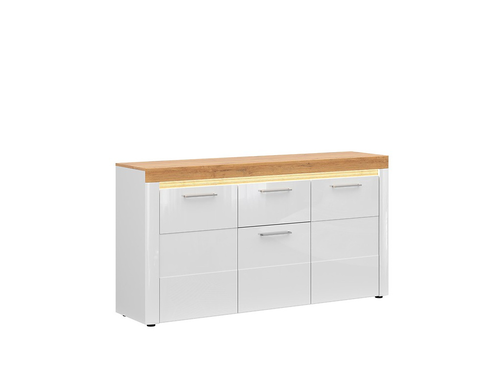 Komoda HORTON je zhotovená z lamina a MDF v barevném provedení bílý lesk/dub zlatý grandson.