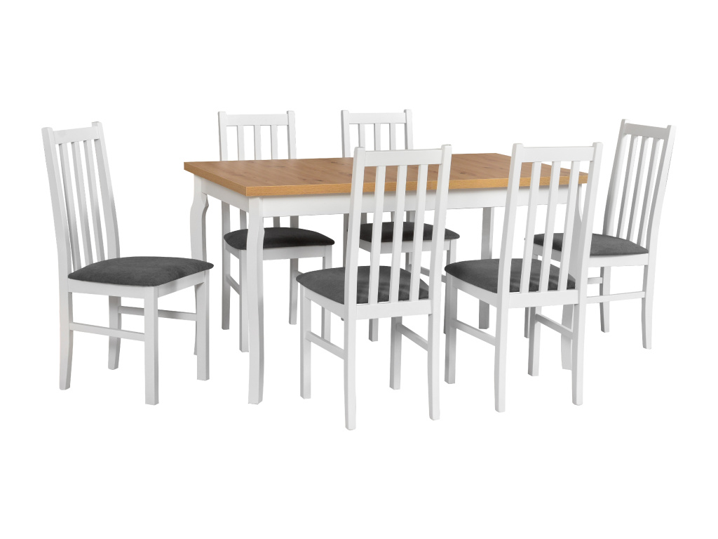 Jídelní sestava NEON 6+1 je svěžím a moderním řešením pro stylové jídelny, kde vynikne kombinace bílé barvy a dekoru Artisan. Součástí sestavy je 6 pohodlných židlí BOS 10 v bílém provedení s čalouněním 2B – Soro 97, které poskytuje vysoký komfort sezení a odolnost při každodenním používání. Rozkládací jídelní stůl ALBA 5 o rozměrech 80 × 140 cm s možností rozložení až na 180 cm nabízí dostatek prostoru pro rodinné stolování i návštěvy, přičemž laminátová deska v dekoru Artisan je nenáročná na údržbu a krásně kontrastuje s bílou podstavou. Jídelní sestava NEON 6+1 spojuje praktičnost, světlý design a pohodlí a stane se přirozeným centrem vaší jídelny.