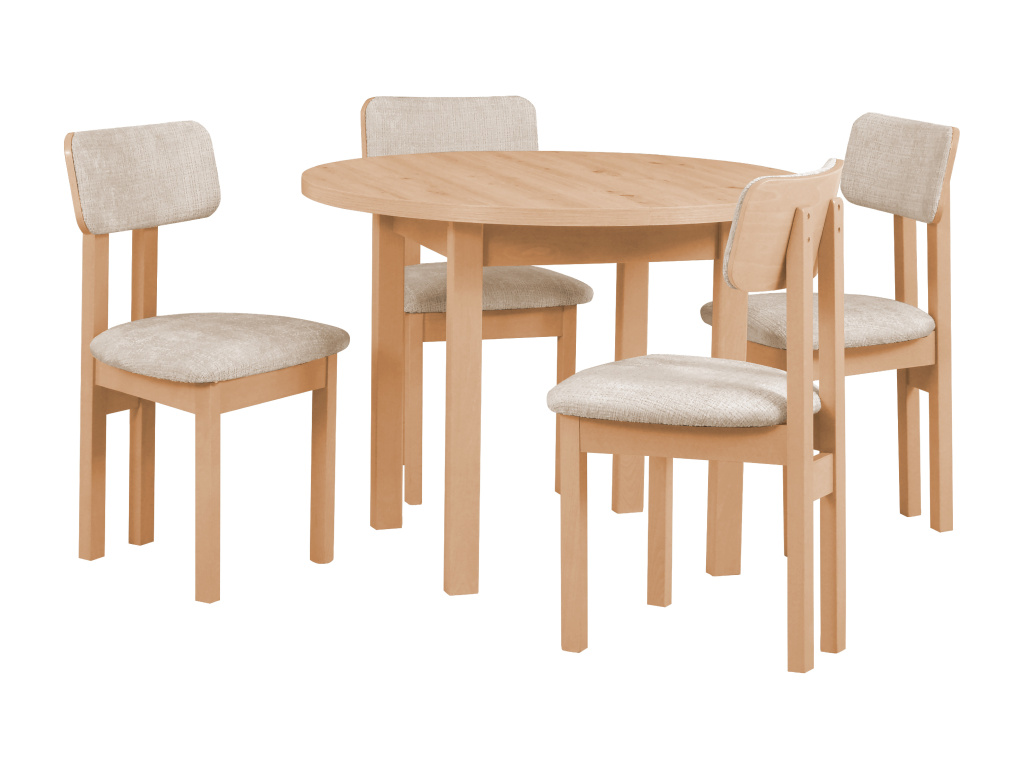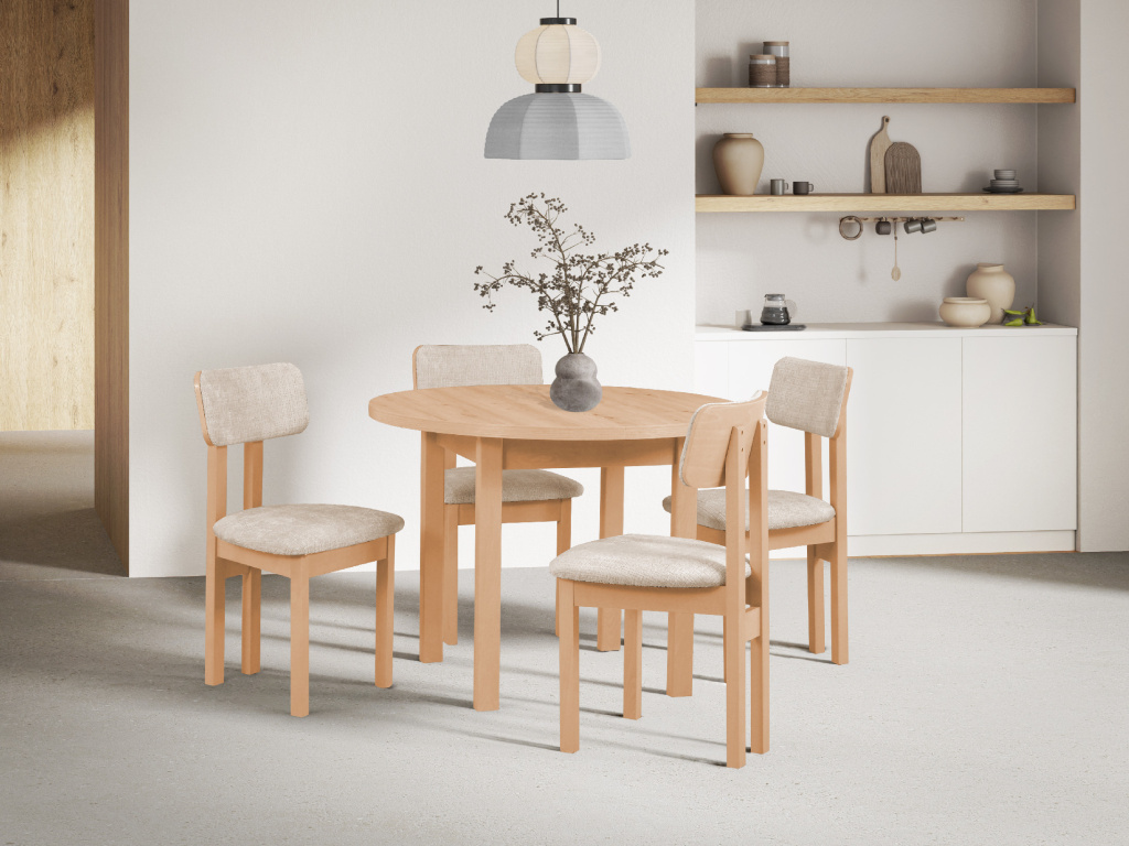 Jídelní sestava Tornero 4+1 je stylovým a praktickým řešením pro moderní i klasické jídelny. Nabízí nadčasový dekor Artisan, který působí přirozeně a snadno se kombinuje s ostatním nábytkem. Součástí sestavy jsou 4 pohodlné židle DIVO čalouněné kvalitní látkou Cremona 02 která je příjemná na dotek a vhodná pro každodenní používání. Rozkládací jídelní stůl POLY 2L o rozměrech 100 × 100 cm s možností rozložení na 130 cm poskytuje dostatek prostoru i při návštěvách, přičemž odolná laminátová deska zajišťuje snadnou údržbu a dlouhou životnost. Nohy stolu v dekoru Artisan podtrhují jednotný a elegantní vzhled celé sestavy, která je ideální volbou pro komfortní a stylové stolování.