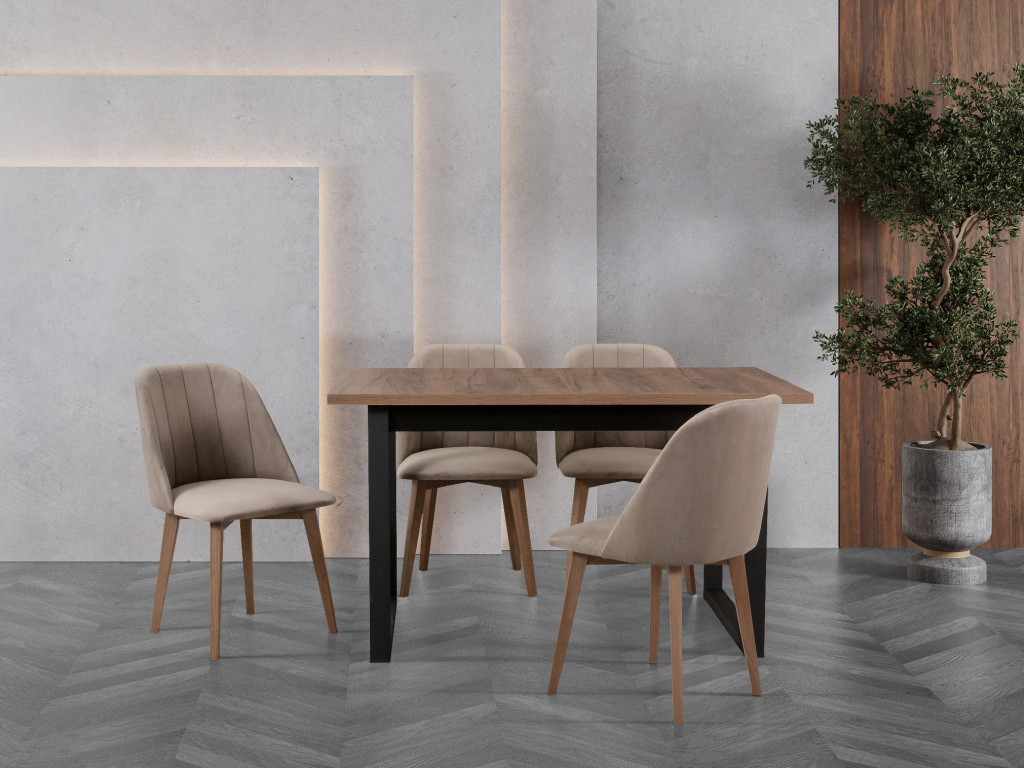 Jídelní set AZE 4+1 se židlemi MONTI 3 s jednoduchým prošíváním je elegantním spojením přírodního dekoru a moderních industriálních prvků, které dodají vaší jídelně styl a útulnou atmosféru. Rozkládací stůl IKON 3 o rozměru 80 × 140–180 cm s laminátovou deskou v dekoru světlý ořech nabízí dostatek prostoru pro každodenní stolování i rodinná setkání, zatímco černé kovové nohy zajišťují stabilitu a výrazný design. Čtyři pohodlné židle MONTI 3 jsou čalouněny kvalitní látkou Riviera 16, která je příjemná na dotek, odolná a vhodná pro každodenní používání, přičemž jednoduché prošívání dodává židlím elegantní vzhled. Jídelní set AZE 4+1 je ideální volbou pro ty, kteří hledají praktické, komfortní a vizuálně atraktivní řešení moderního stolování.