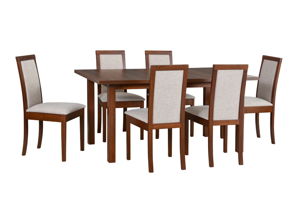 Jídelní set NEO 6+1 je elegantním a nadčasovým řešením pro prostornější jídelny a rodinné interiéry, kde vynikne teplý dekor ořech a harmonický design. Součástí setu je 6 pohodlných židlí ROMA 4 v provedení ořech s čalouněním 11B – Neve 13, které zajišťuje komfortní sezení a příjemný vzhled i při každodenním používání. Rozkládací jídelní stůl MODENA 2 o rozměrech 92 × 160 cm s možností rozložení až na 200 cm nabízí dostatek prostoru pro rodinné stolování i posezení s přáteli, přičemž laminátová deska v dekoru ořech je odolná, snadno udržovatelná a dokonale ladí se základní barvou celé sestavy. Jídelní set NEO 6+1 spojuje funkčnost, pohodlí a klasickou eleganci, díky čemuž se stane přirozeným centrem vaší jídelny.