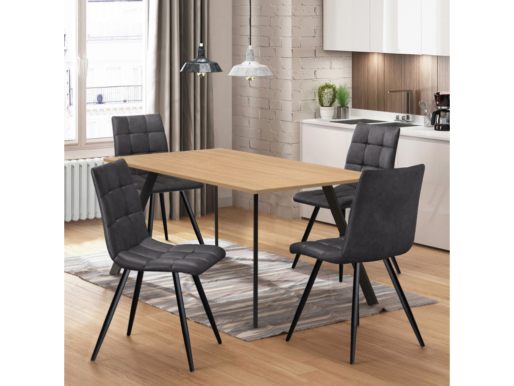 Jídelní set BERGEN zahrnuje elegantní jídelní stůl 120×80 cm v dekoru dub s pevnou černou kovovou konstrukcí a čtyři pohodlné židle s antracitovým mikrovláknovým potahem v imitaci broušené kůže a černou kovovou podnoží. Stůl s kvalitní MDF deskou nabízí vysokou odolnost, stabilitu a snadnou údržbu, zatímco kovová konstrukce podtrhuje moderní industriální charakter. Židle o rozměrech 45×52×88 cm s výškou sedu 51 cm zajišťují komfortní sezení díky ergonomickému tvaru a příjemnému mikrovláknovému potahu. Nadčasová kombinace dubového dekoru, černého kovu a šedého čalounění se skvěle hodí do moderní i klasické jídelny a celý set přináší ideální spojení stylu, funkčnosti a pohodlí.