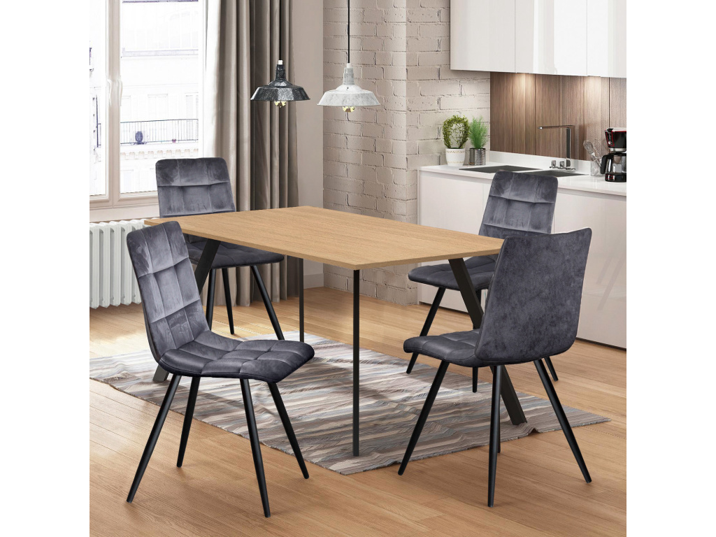 Jídelní set BERGEN tvoří stylový jídelní stůl 120×80 cm v dekoru dub s pevnou černou kovovou konstrukcí a čtyři elegantní židle se šedým sametovým potahem a černou kovovou podnoží. Stůl s odolnou deskou z MDF nabízí stabilitu, dlouhou životnost a snadnou údržbu, zatímco kovová konstrukce podtrhuje moderní industriální vzhled. Židle o rozměrech 44×54×88 cm s výškou sedu 51 cm zajišťují pohodlné sezení díky ergonomickému tvaru a příjemnému sametovému potahu, který dodává interiéru nádech elegance a luxusu. Nadčasová kombinace dubového dekoru, černého kovu a šedého sametu se skvěle hodí do moderní i klasické jídelny a celý set představuje ideální spojení komfortu, funkčnosti a designu.