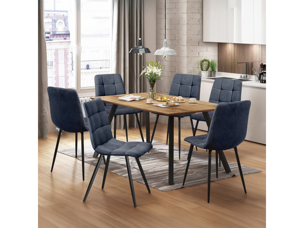 Jídelní set BERGEN s prostorným stolem 140 × 80 cm v dekoru dub Wotan a šesti pohodlnými židlemi v antracitovém provedení je ideální volbou pro větší rodinu i společné stolování s přáteli. Stůl s kvalitní MDF deskou a pevnou černou kovovou konstrukcí nabízí vysokou stabilitu, odolnost a moderní industriální vzhled. Židle o rozměrech 45 × 55 × 88 cm s příjemným textilním potahem a černou kovovou podnoží zajišťují komfortní sezení i při delším posezení. Nadčasová kombinace dubového dekoru, černého kovu a šedého čalounění se snadno začlení do moderní i klasické jídelny a poskytne dostatek prostoru, pohodlí a stylu pro každodenní používání.