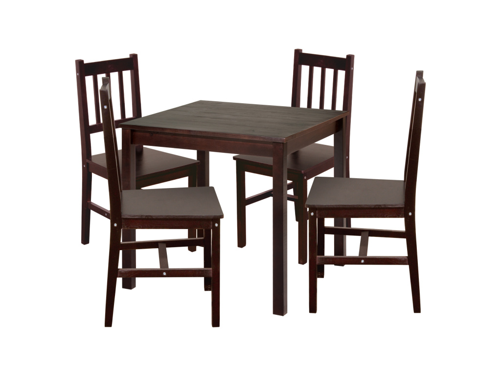Jídelní sestava, skládající se z jídelního stolu 8842H a čtyř jídelních židlí 869H, představuje elegantní a praktický přídavek do každé jídelny či kuchyně. Celá sestava je vyrobena z pevného masivu borovice a dokončena tmavohnědým lakem, který podtrhuje přirozenou krásu dřeva a dodává celému setu moderní a sofistikovaný vzhled.