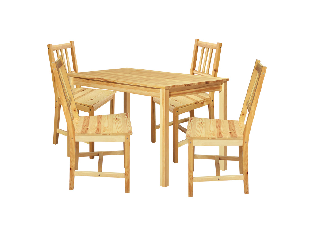 Jídelní sestava, skládající se z jídelního stolu 8848 a čtyř jídelních židlí 869, je vytvořena z kvalitního masivu borovice a ošetřena lakem, který dodává celému setu elegantní a čistý vzhled. Díky lakovanému provedení je povrch nábytku snadno udržovatelný a odolný proti každodennímu opotřebení, což zajišťuje jeho dlouhodobou krásu a funkčnost.