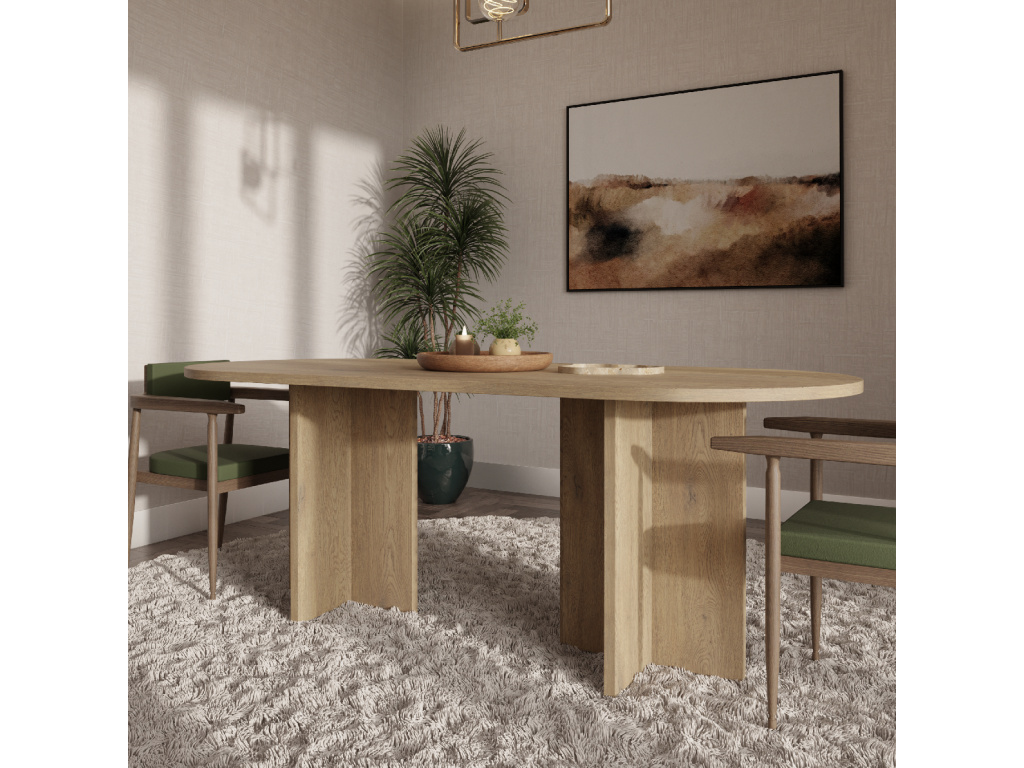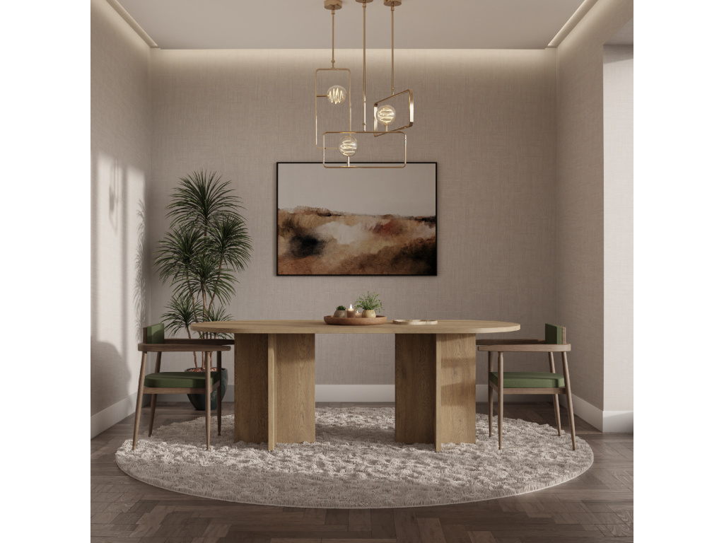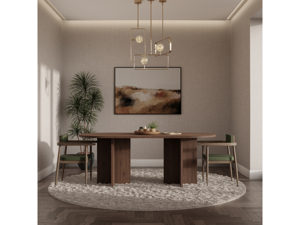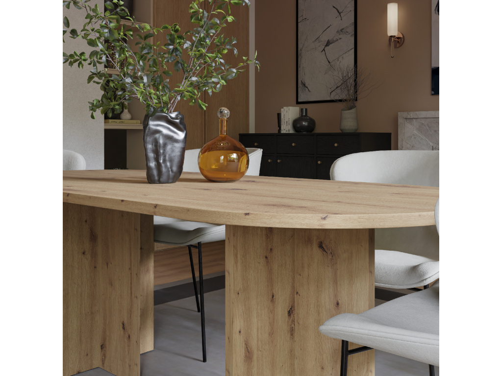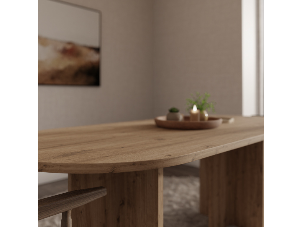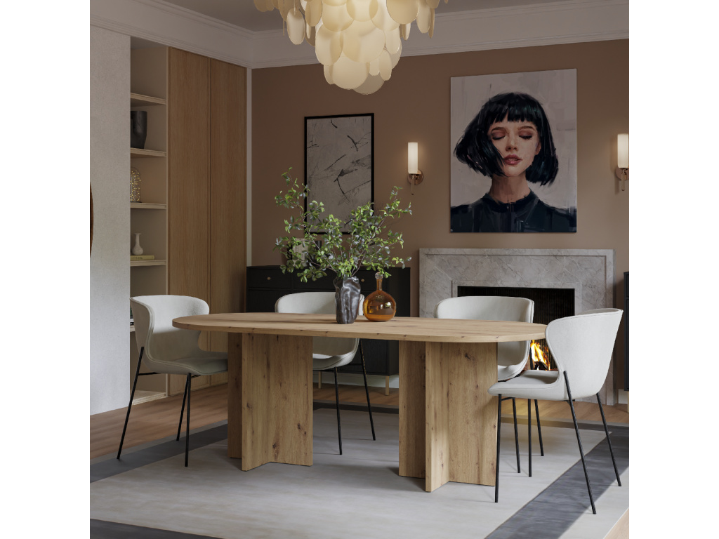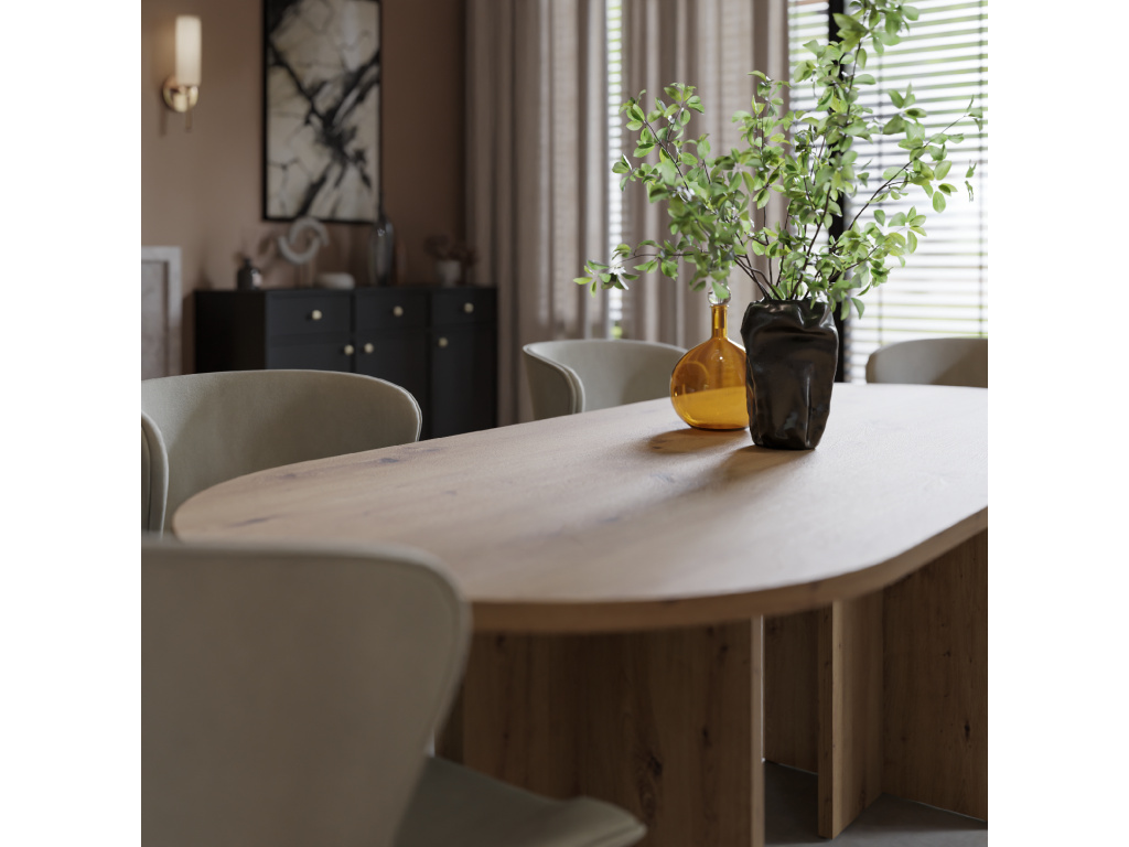 Jídelní stůl LOEN zaujme moderním designem, čistými liniemi a důrazem na funkčnost, díky čemuž se stane přirozeným středobodem každé jídelny. Pevná vrcholová deska z 28mm laminované desky v kombinaci se stabilní základnou ze stejného materiálu zajišťuje vysokou odolnost, dlouhou životnost a stabilitu při každodenním používání. Velkorysé rozměry 204 × 90 × 75 cm poskytují dostatek prostoru pro pohodlné stolování celé rodiny i setkání s přáteli. Díky možnosti volby barevného provedení z nabídky Artisan, Okapi, Portland nebo Cremona lze stůl snadno sladit s interiérem a vytvořit harmonický a stylový prostor pro společné chvíle.