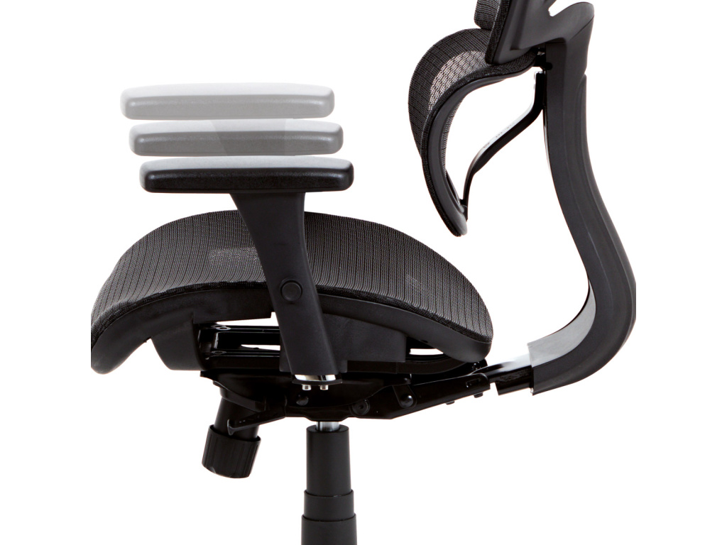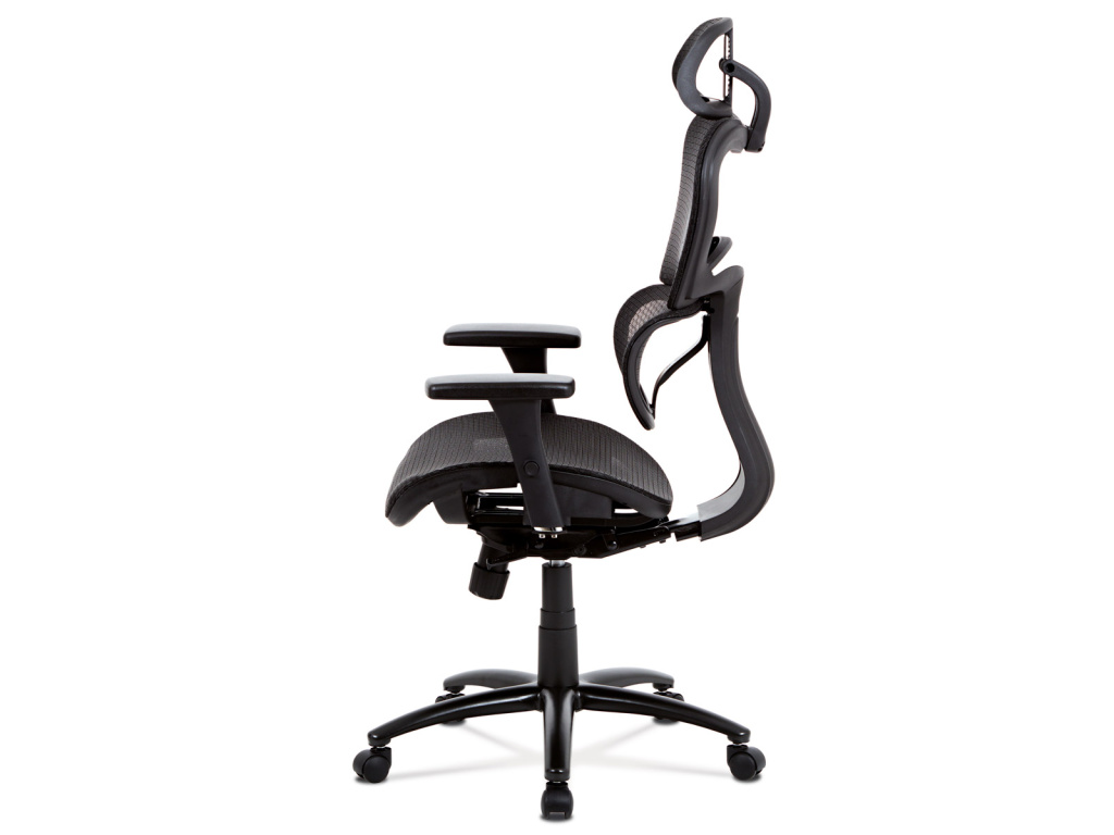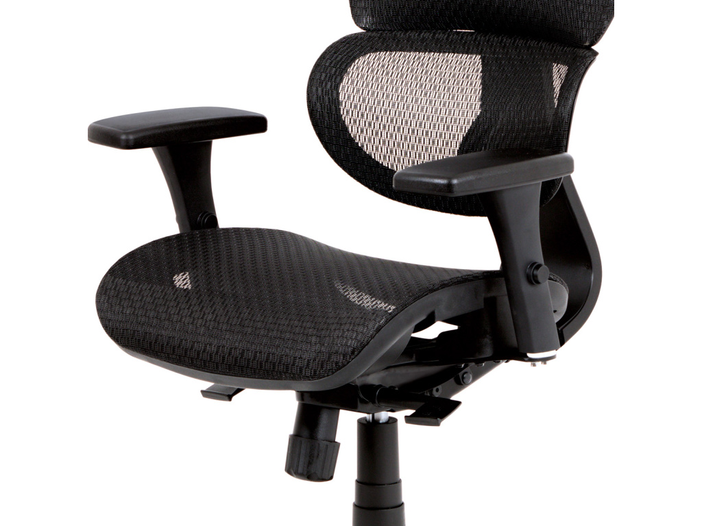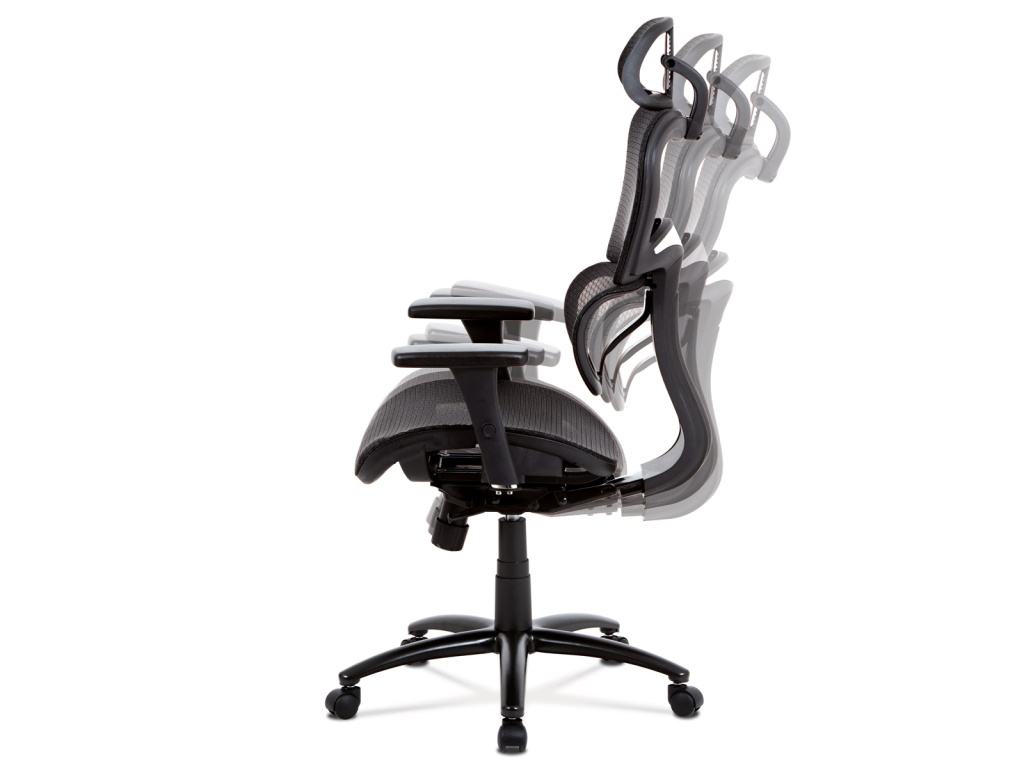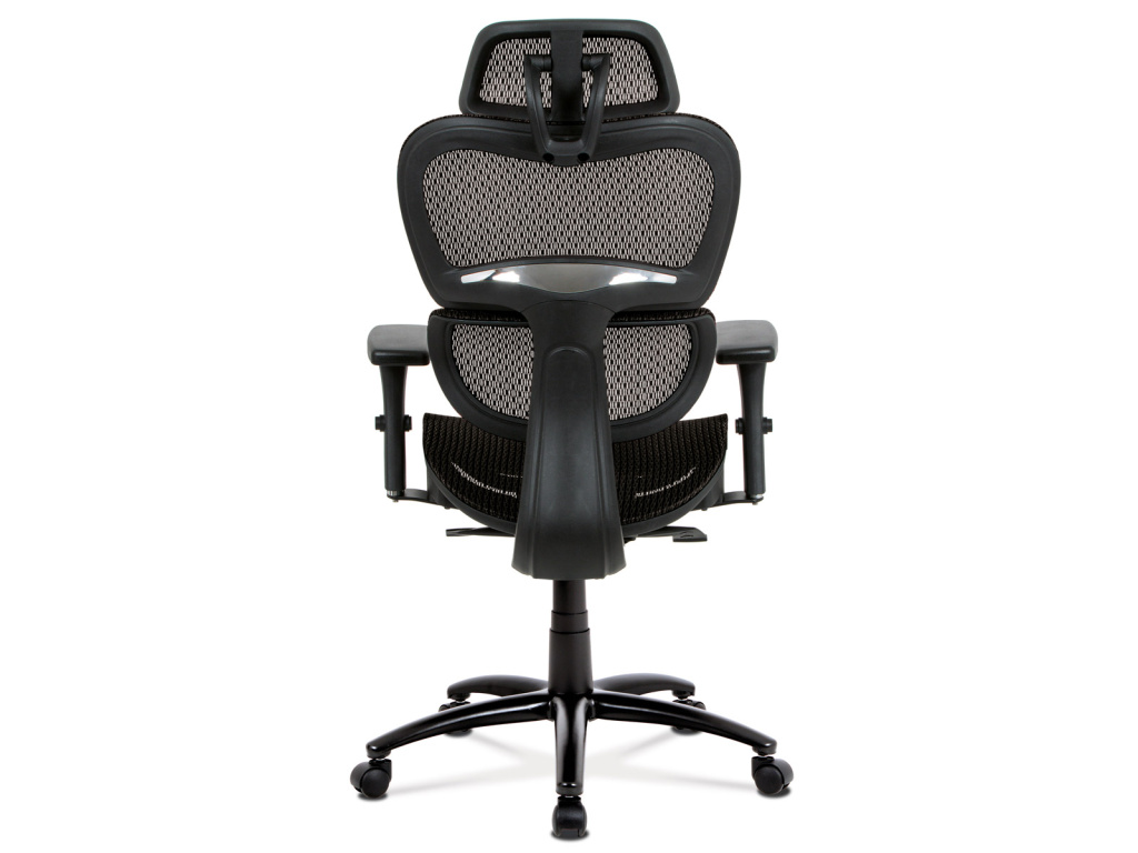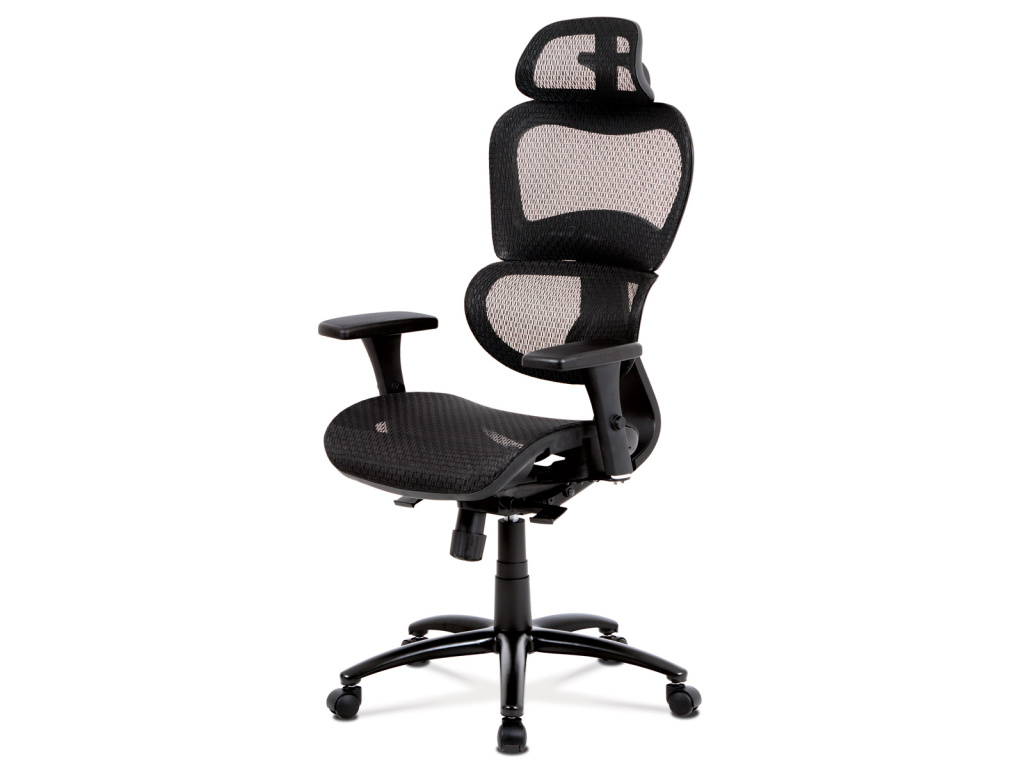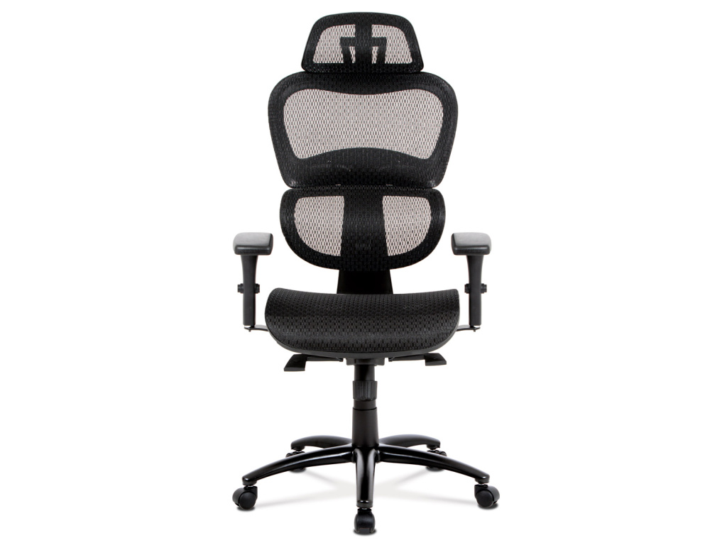 Designová kancelářská židle v kategorii TOP manager. Potah je ze síťoviny MESH v černé barvě. Synchronní mechanismus lze aretovat v několika polohách. Područky umožňují nastavit výšku i posouvat měkčené opěrky vpřed a vzad. Opěrka hlavy je horizontálně i vertikálně nastavitelná. Kříž je kovový, černý matný a kolečka univerzální. Opěrák je prodyšný a speciálně ergonomicky tvarovaný pro správné a zdravé držení zad i při náročné kancelářské práci.Doplňkové parametry