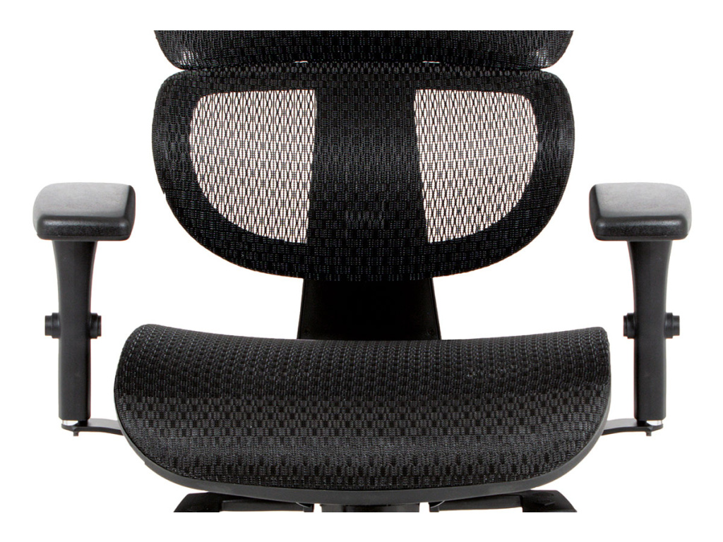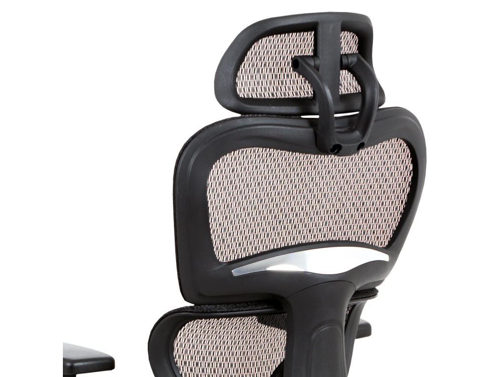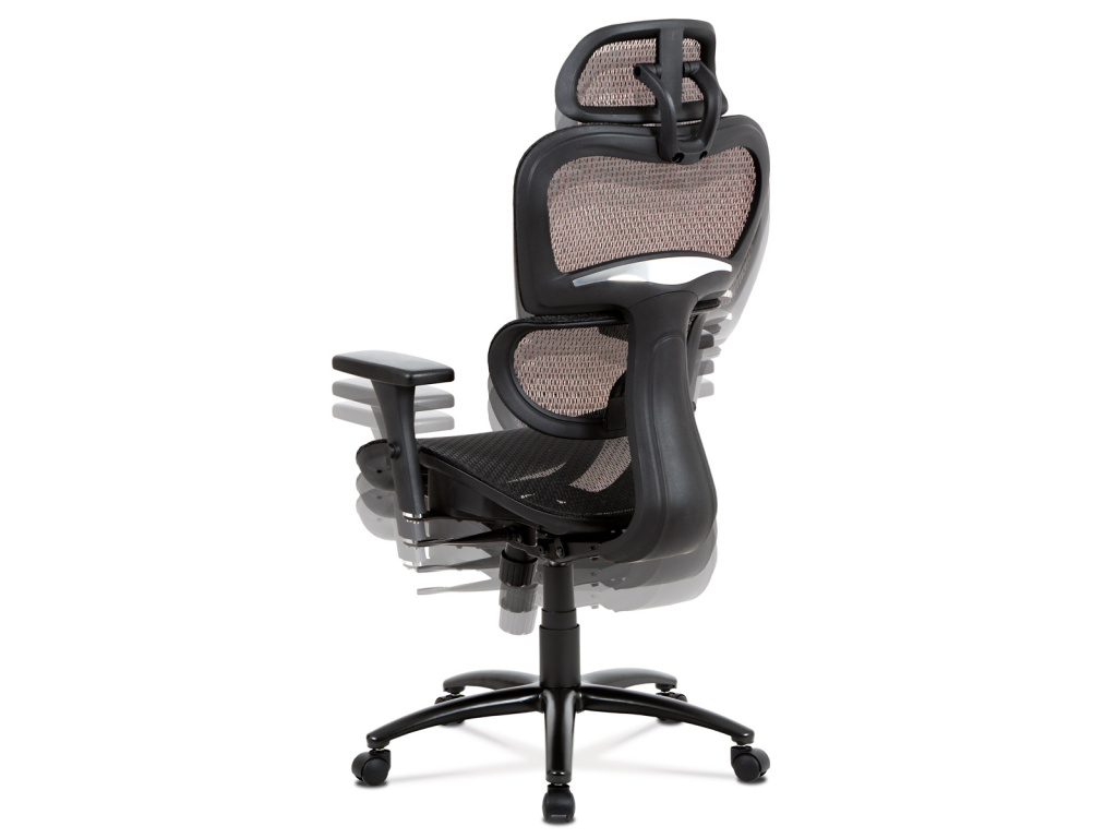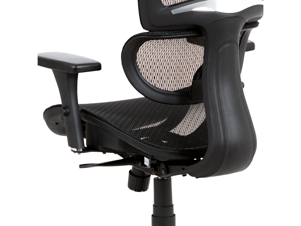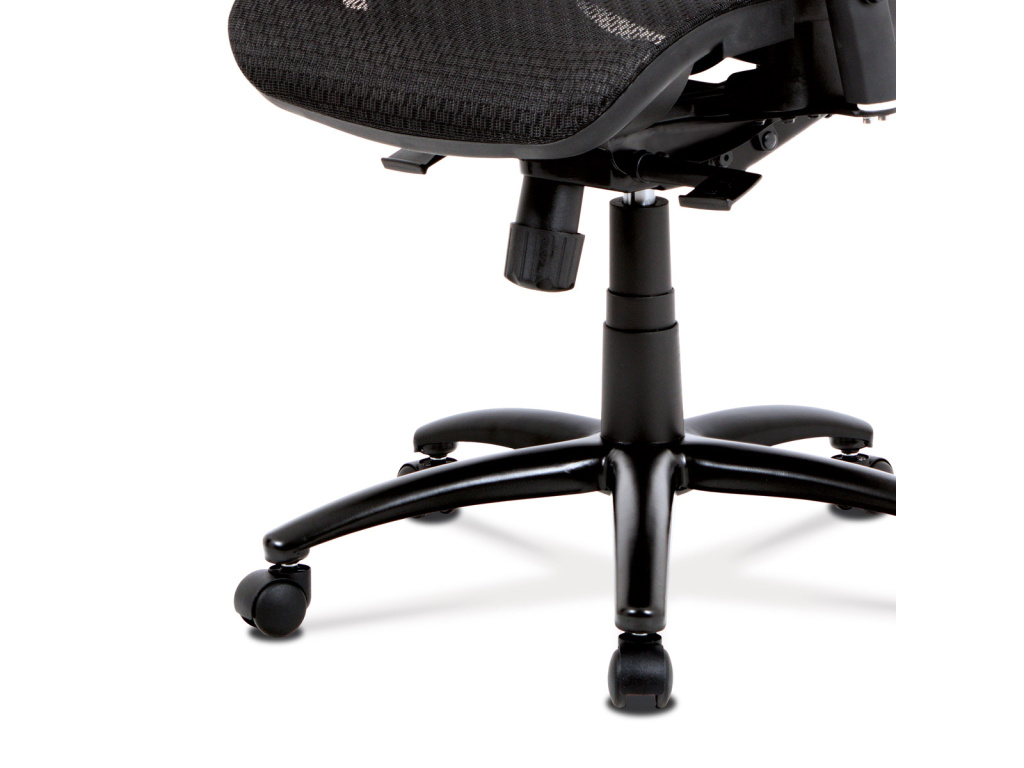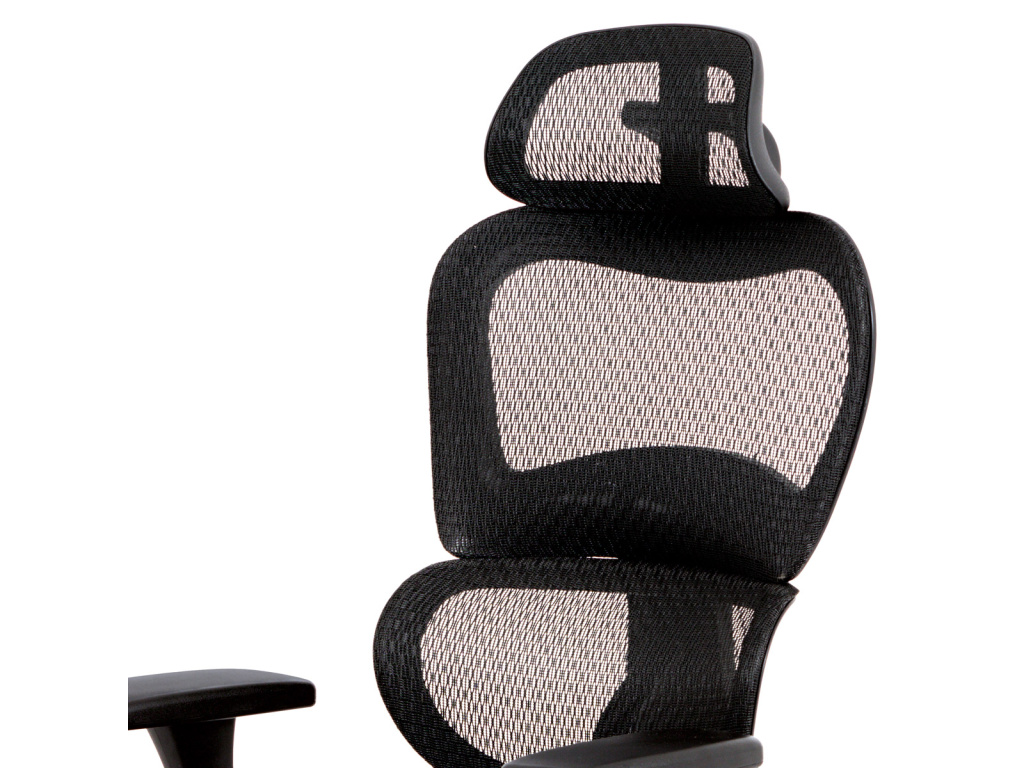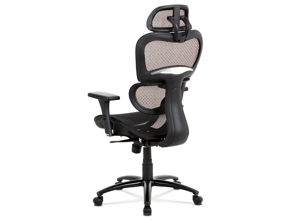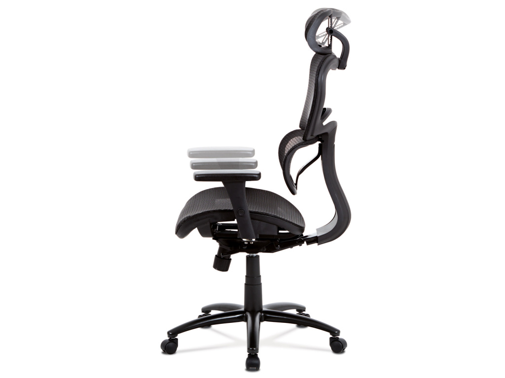 Designová kancelářská židle v kategorii TOP manager. Potah je ze síťoviny MESH v černé barvě. Synchronní mechanismus lze aretovat v několika polohách. Područky umožňují nastavit výšku i posouvat měkčené opěrky vpřed a vzad. Opěrka hlavy je horizontálně i vertikálně nastavitelná. Kříž je kovový, černý matný a kolečka univerzální. Opěrák je prodyšný a speciálně ergonomicky tvarovaný pro správné a zdravé držení zad i při náročné kancelářské práci.Doplňkové parametry
