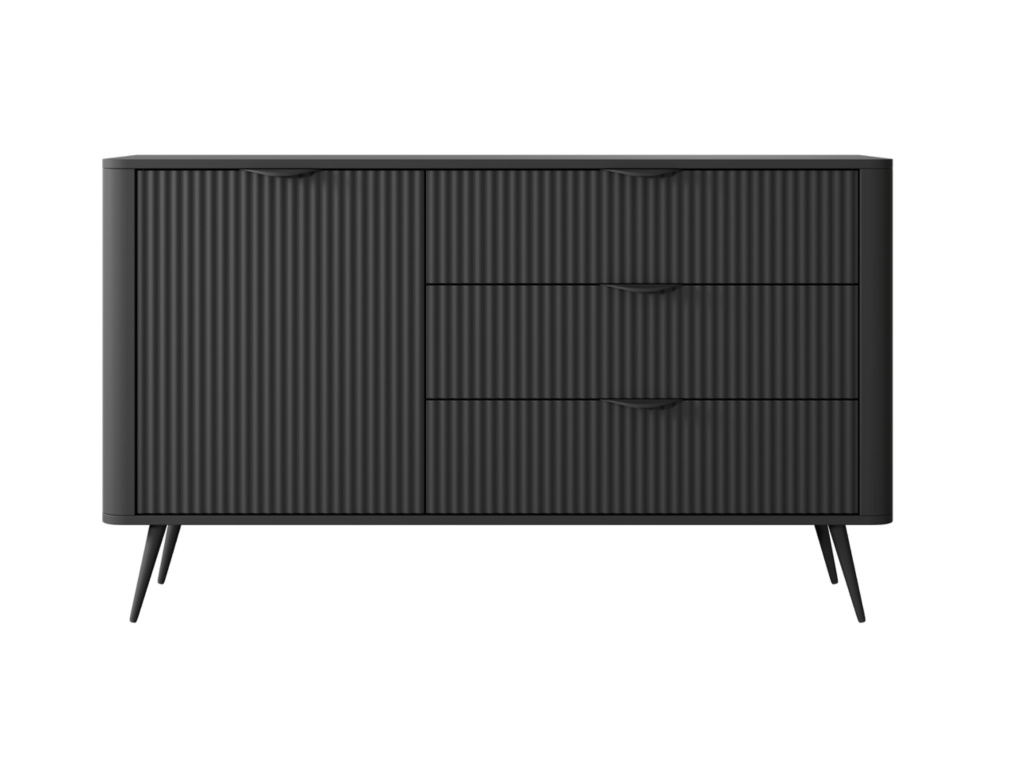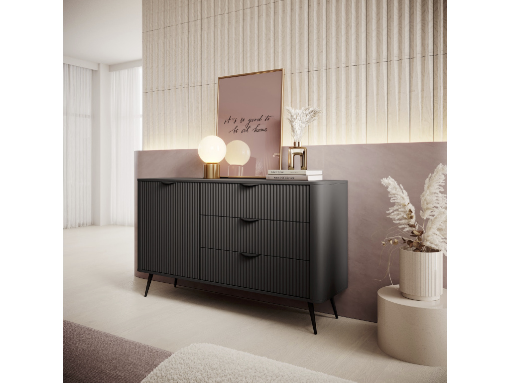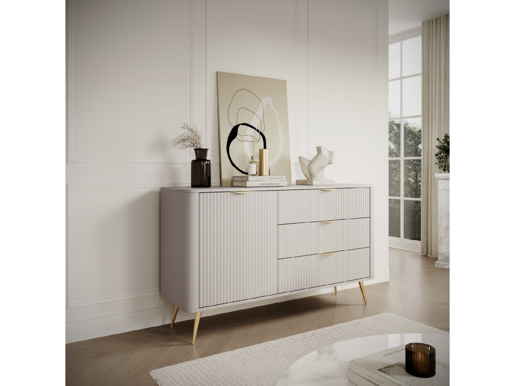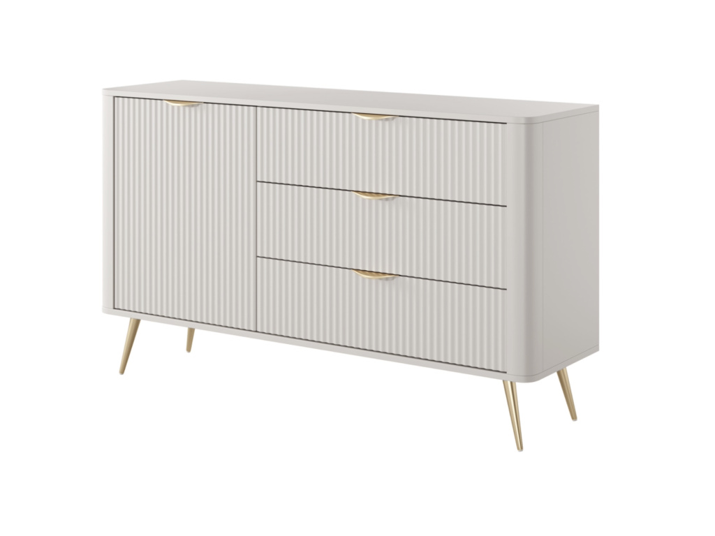 Komoda Lante o šířce 138 cm s jedněmi dvířky a třemi šuplíky je ideálním spojením moderního designu a praktické funkčnosti, dostupná v barevném provedení béžová nebo černá. Korpus je vyroben z laminované dřevotřísky E05 o tloušťce 16 mm a doplněn o zaoblené MDF lamely, které dodávají elegantní a stylový vzhled. Přední strana z MDF desky o tloušťce 18 mm je v béžové nebo černé barvě, což podtrhuje sofistikovanost a krásu komody. HDF desky se strukturou dřeva v bílé nebo černé barvě dodávají nábytku přírodní a harmonický vzhled. Ráfky s ABS hranami zvyšují odolnost a životnost nábytku. Kovové rukojeti a nohy ve zlaté barvě (u černé varianty černé barvy) přinášejí luxusní nádech. Šuplíky jsou vybaveny kuličkovými vedeními s plným výsuvem, což zajišťuje snadné otevírání a maximální využití úložného prostoru. Paralelní nebo dvojité panty garantují pevnost a dlouhou životnost. Komoda Lante je perfektní volbou pro moderní interiéry, nabízí dostatek úložného prostoru a elegantní design, který zapadne do každé místnosti.