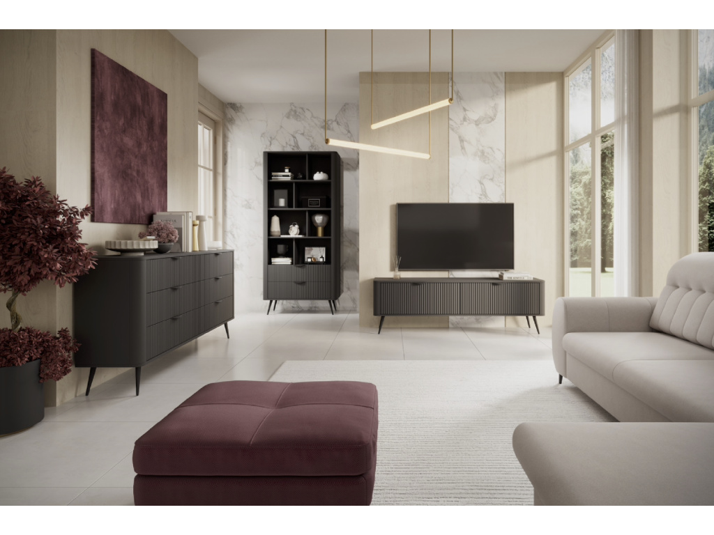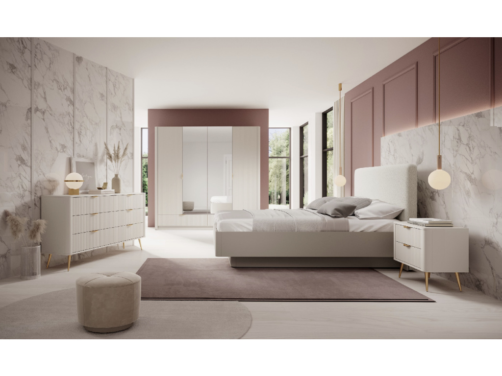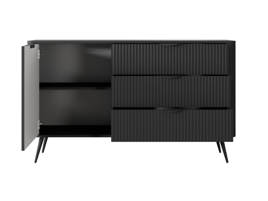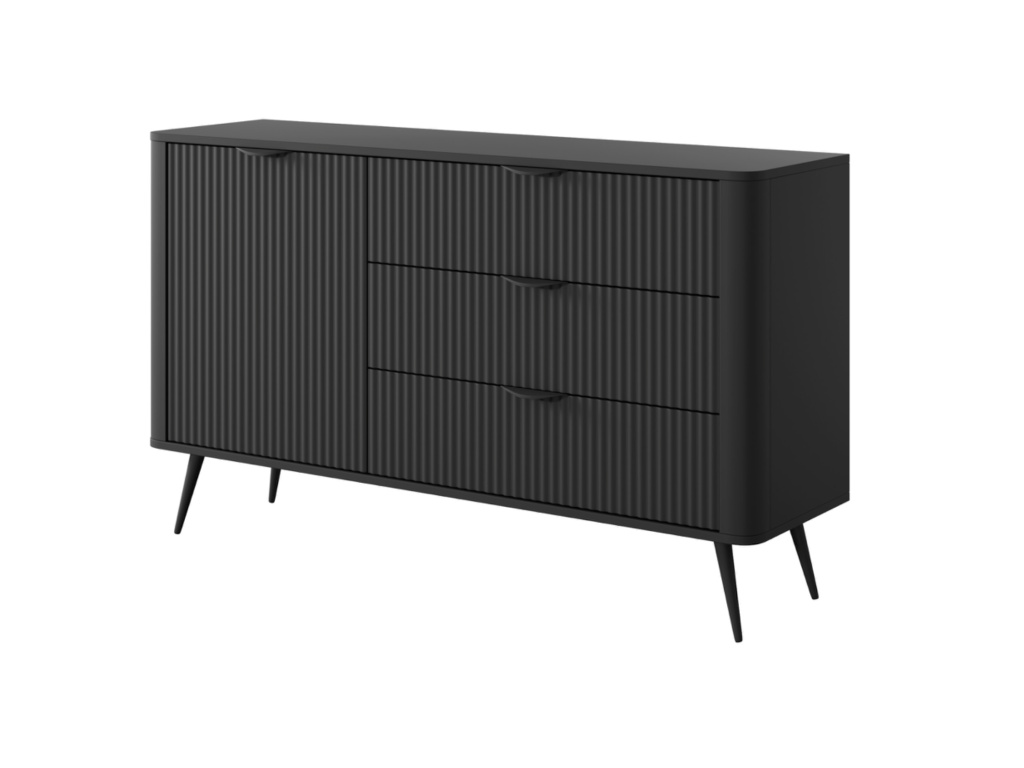 Komoda Lante o šířce 138 cm s jedněmi dvířky a třemi šuplíky je ideálním spojením moderního designu a praktické funkčnosti, dostupná v barevném provedení béžová nebo černá. Korpus je vyroben z laminované dřevotřísky E05 o tloušťce 16 mm a doplněn o zaoblené MDF lamely, které dodávají elegantní a stylový vzhled. Přední strana z MDF desky o tloušťce 18 mm je v béžové nebo černé barvě, což podtrhuje sofistikovanost a krásu komody. HDF desky se strukturou dřeva v bílé nebo černé barvě dodávají nábytku přírodní a harmonický vzhled. Ráfky s ABS hranami zvyšují odolnost a životnost nábytku. Kovové rukojeti a nohy ve zlaté barvě (u černé varianty černé barvy) přinášejí luxusní nádech. Šuplíky jsou vybaveny kuličkovými vedeními s plným výsuvem, což zajišťuje snadné otevírání a maximální využití úložného prostoru. Paralelní nebo dvojité panty garantují pevnost a dlouhou životnost. Komoda Lante je perfektní volbou pro moderní interiéry, nabízí dostatek úložného prostoru a elegantní design, který zapadne do každé místnosti.