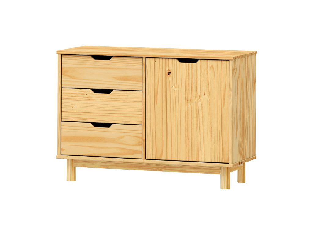 Komoda BONITO 2 z masivní borovice v kvalitním lakovaném provedení nabízí kombinaci elegance a funkčnosti – tři zásuvky s kovovými pojezdy a jedno dvířko s policí poskytují dostatek místa pro přehledné uložení věcí, zatímco odolný lakovaný povrch chrání dřevo a zvýrazňuje jeho přirozenou kresbu, což z komody činí praktický a stylový doplněk do každého interiéru.