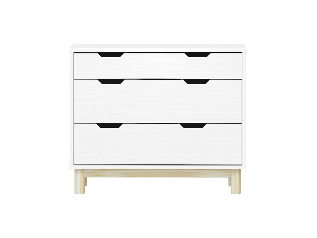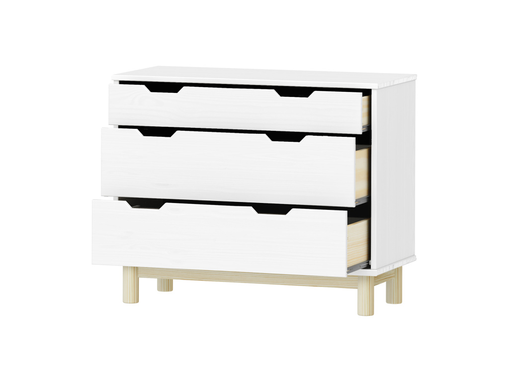 Komoda 2+1 zásuvky BONITO 2 v elegantním bílém laku je stylový a praktický kus nábytku z kvalitního masivu borovice, který dodá interiéru svěžest a moderní vzhled. Nabízí jednu menší a dvě prostorné zásuvky s hladkými kovovými pojezdy, takže se snadno otevírají a poskytují dostatek místa pro přehledné uložení všech potřebných věcí. Díky pevnému zpracování, nadčasové bílé barvě a chytrému vnitřnímu uspořádání je komoda ideální do ložnice, předsíně i obývacího pokoje.