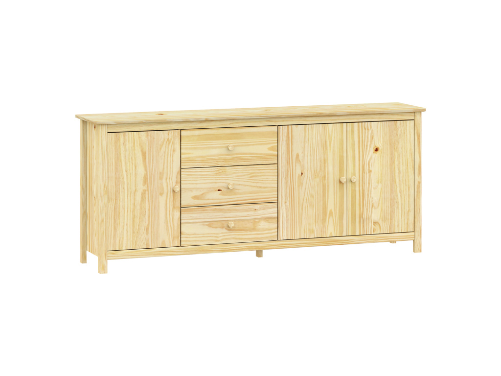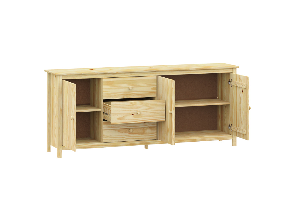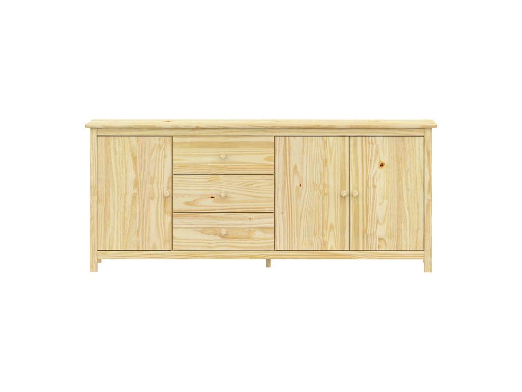 Komoda 3 dveře + 3 zásuvky TORINO je vyrobena z masivní borovice v odolném lakovaném provedení, které chrání povrch a zvýrazňuje přírodní kresbu dřeva. Nabízí 3 praktické zásuvky s kvalitními kovovými pojezdy, 3 plné dveře a 2 vnitřní police pro přehledné uspořádání uložených věcí. Maximální nosnosti jednotlivých částí jsou uvedeny v návodu k montáži.