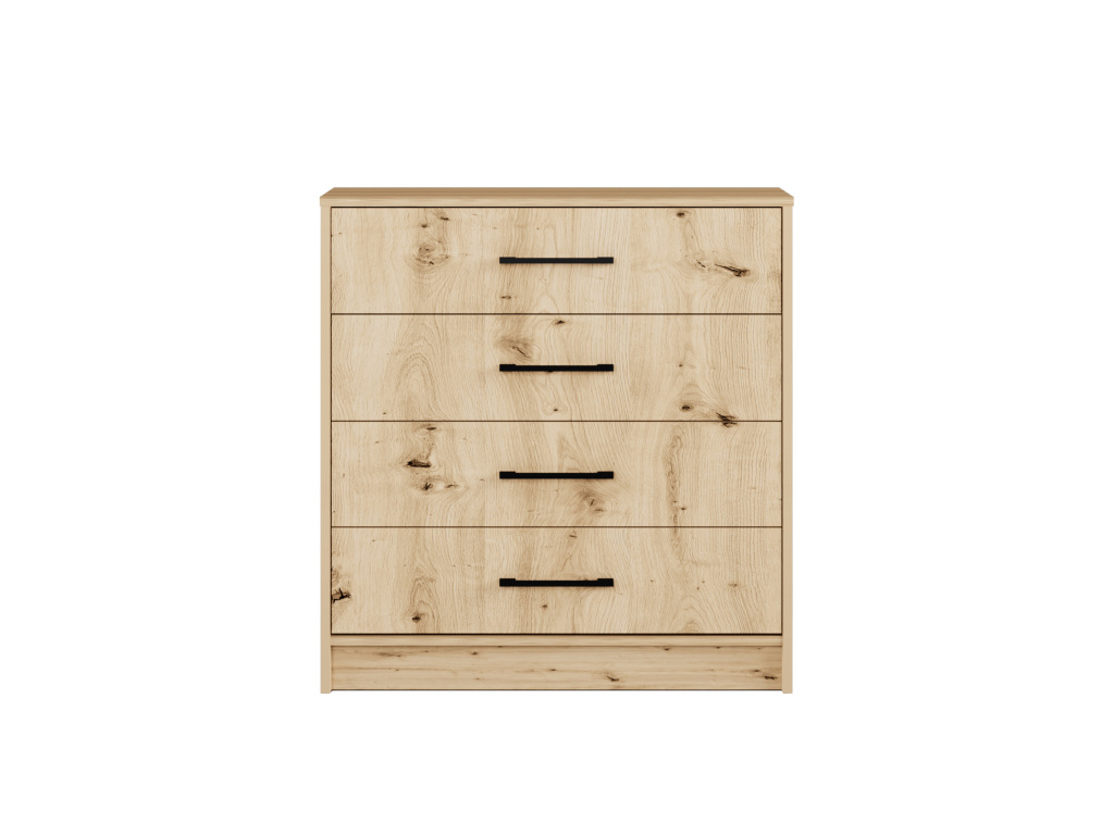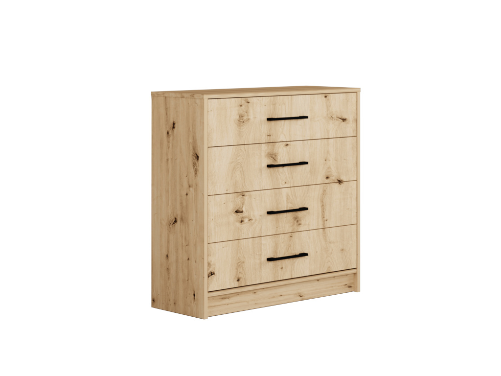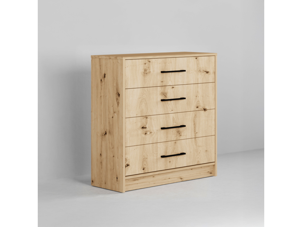 Komoda ARTI 80 v elegantním provedení Dub artisan je praktickým a stylovým doplňkem interiéru, čtyři prostorné šuplíky poskytují dostatek místa pro přehledné uložení věcí a moderní černé úchyty dodávají komodě výrazný vzhled, který skvěle zapadne do současných i industriálních interiérů.