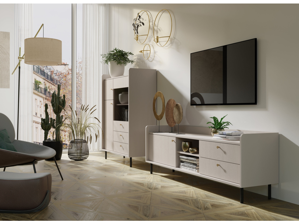 Kolekce Grande oslní moderním designem v jemném pískovém odstínu s texturou připomínající přírodní dřevo. Unikátním prvkem jsou vyvýšené okraje, které nejenže působí esteticky, ale také zabraňují pádu předmětů. Díky svému nadčasovému zpracování a praktickým detailům se komoda hodí do obývacího pokoje, pracovny nebo předsíně. Skvěle vynikne samostatně i jako součást celé kolekce Grande, kterou si oblíbíte pro její kvalitu a funkčnost.