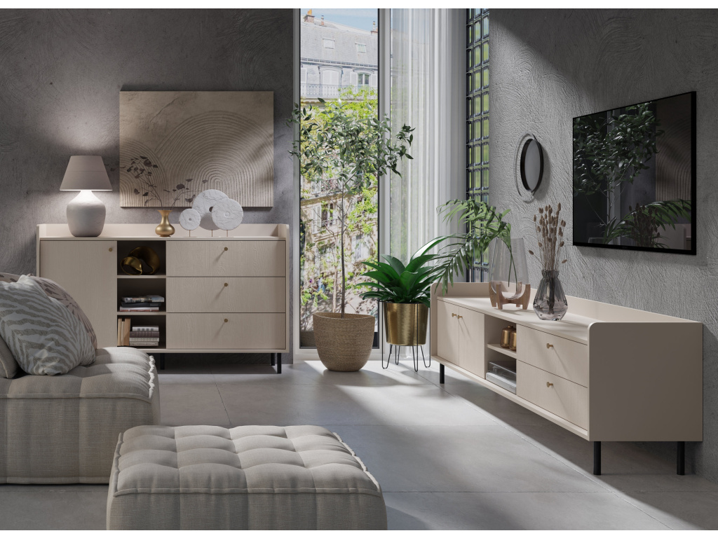 Tato komoda je součástí kolekce Grande, která zaujme svým moderním designem v jemném pískovém odstínu béžové barvy s decentní strukturou dřeva. Vyvýšené okraje jsou praktickým prvkem, který zabraňuje pádu předmětů a zároveň přidává na estetickém dojmu. Díky svému nadčasovému zpracování je komoda Grande ideální volbou do obývacího pokoje, pracovny nebo předsíně. Skvěle vynikne jako samostatný prvek nebo jako součást celé kolekce Grande, která je zárukou kvality a funkčnosti.