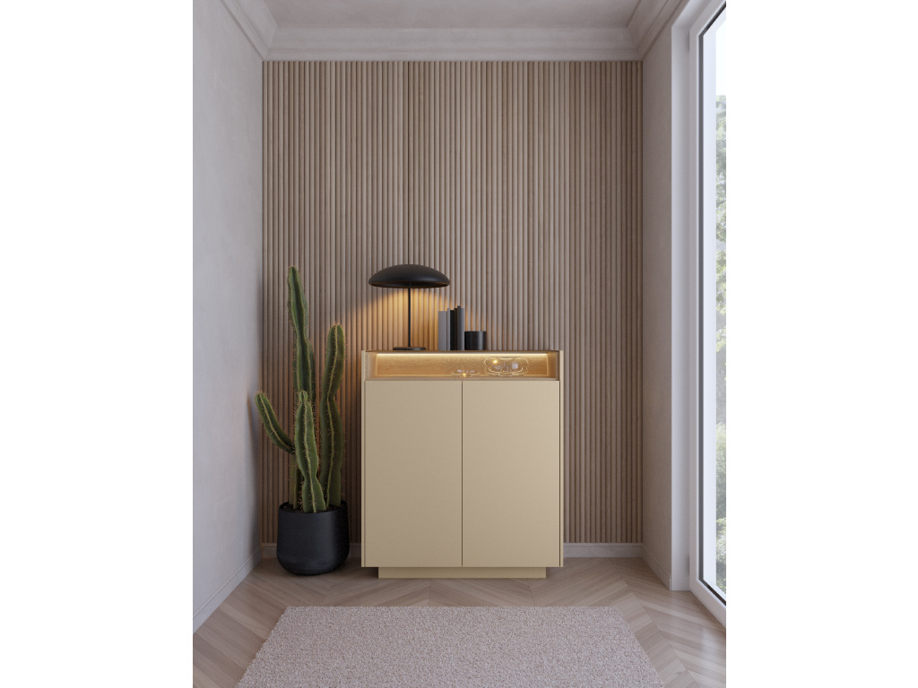 Komoda Hiro 2D nabízí prakticky řešený úložný prostor ukrytý za dvojicí dvířek, díky kterému snadno udržíte pořádek v obývacím pokoji. Součástí je také LED osvětlení v ceně, které dodá interiéru příjemnou atmosféru. Sektorový nábytek Hiro je ideální volbou pro milovníky moderního designu s jemným přírodním nádechem. Kombinace dekoru dub Cremona s tóny kakaa nebo béžové vytváří nadčasový a útulný vzhled obývacího pokoje. Praktické detaily jako push-to-open systém, tiché dovírání a integrované LED osvětlení zajišťují komfort při každodenním používání.