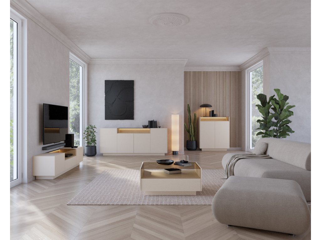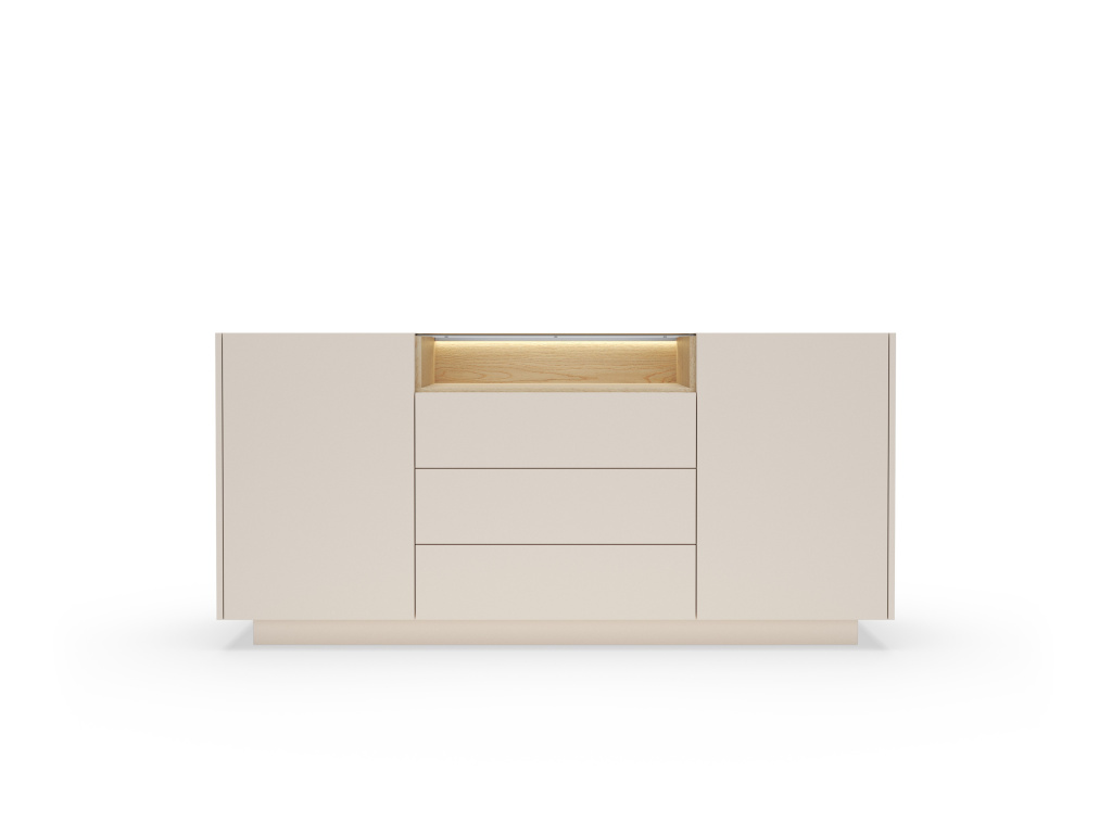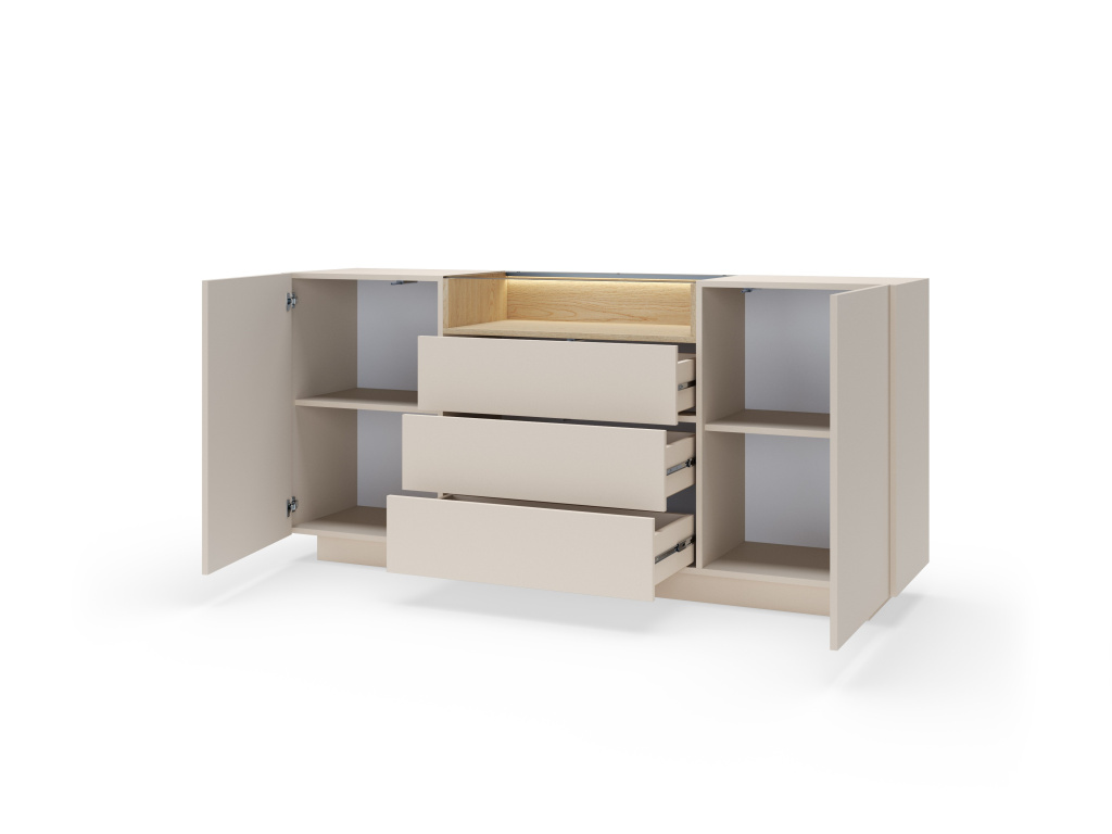 Komoda Hiro 2D3S kombinuje uzavřený úložný prostor za dvířky se třemi zásuvkami, takže nabízí praktické řešení pro přehledné uspořádání věcí. Součástí je také LED osvětlení v ceně, které dodá interiéru příjemnou atmosféru. Sektorový nábytek Hiro je ideální volbou pro milovníky moderního designu s jemným přírodním nádechem. Kombinace dekoru dub Cremona s tóny kakaa nebo béžové vytváří nadčasový a útulný vzhled obývacího pokoje. Praktické detaily jako push-to-open systém, tiché dovírání a integrované LED osvětlení zajišťují komfort při každodenním používání.