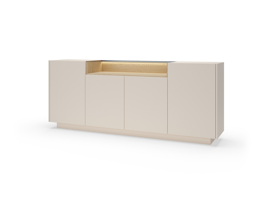 Komoda Hiro 4D nabízí velkorysý úložný prostor ukrytý za čtveřicí dvířek, díky kterému snadno uspořádáte vše potřebné. Součástí je také LED osvětlení v ceně, které dodá interiéru příjemnou atmosféru. Sektorový nábytek Hiro je ideální volbou pro milovníky moderního designu s jemným přírodním nádechem. Kombinace dekoru dub Cremona s tóny kakaa nebo béžové vytváří nadčasový a útulný vzhled obývacího pokoje. Praktické detaily jako push-to-open systém, tiché dovírání a integrované LED osvětlení zajišťují komfort při každodenním používání.