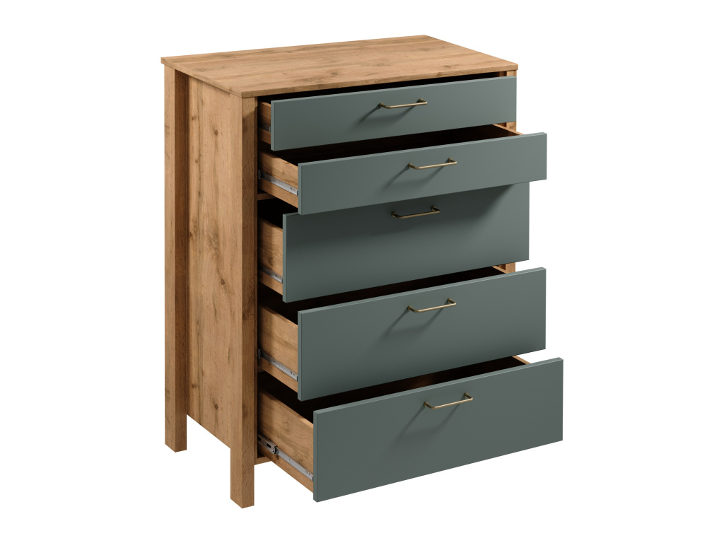 Indigo šuplíková komoda K5S je vrcholným příkladem elegance, praktičnosti a personalizace, vše zabaleno do jednoho stylového kusu nábytku. S možností vybrat si dvířka ve okouzlujících barvách - béžová a zelená - vám tato komoda umožní odrážet vaši osobnost a vkus v každém detailu vašeho domova. Kombinace s moderním dekorem dřeva Dub wotan dodává tomuto nábytku teplý a příjemný vzhled, který bez námahy doplní různé interiérové styly, od jednoduchých a minimalistických až po ty bohatě zdobené a detailní.