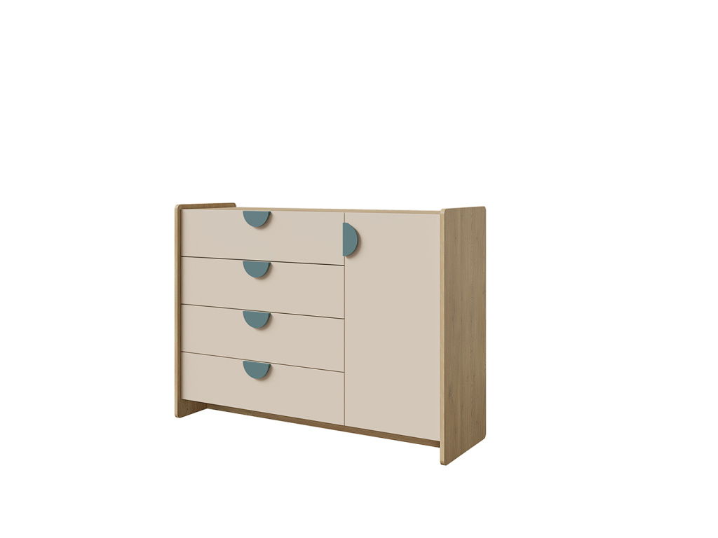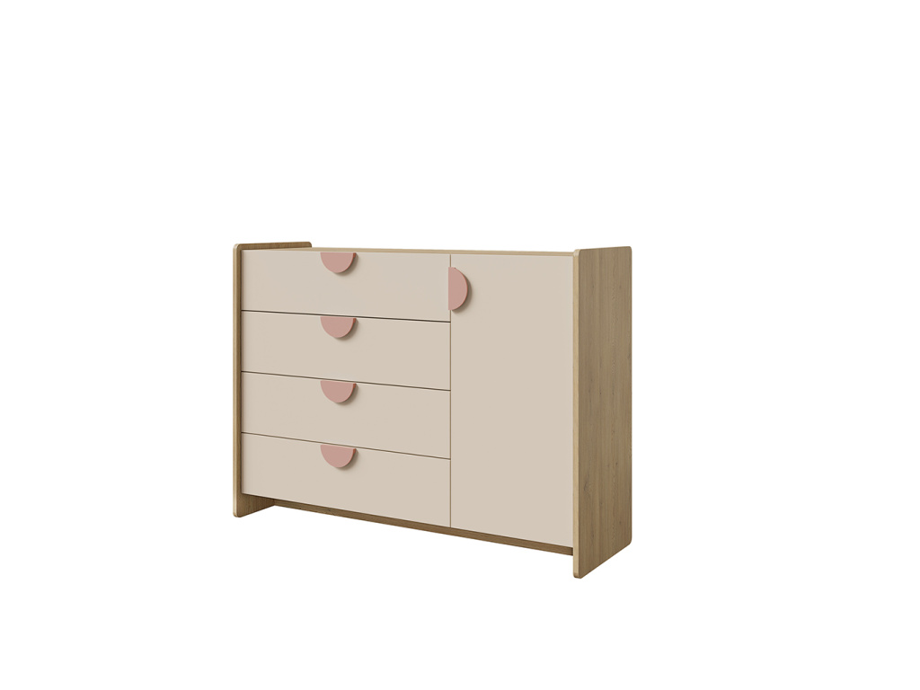 Komoda LEXI 9 nabízí praktický úložný prostor pro přehledné uspořádání dětského pokoje. Čtyři zásuvky poskytují dostatek místa pro uložení oblečení, hraček nebo dalších nezbytností, které chcete mít snadno po ruce. Jednodveřová část komody pak umožňuje uschovat věci, které chcete mít uklizené mimo dohled, a pomáhá udržet v pokoji pořádek a přehlednost. Design komody zaujme kombinací dekoru dub Cremona a odstínu makadamie, doplněnou o jemný barevný akcent v pudrově růžové nebo mořské modré, který dodává nábytku moderní a hravý vzhled vhodný do dětského interiéru. Komoda je součástí sektorového systému LEXI, který umožňuje kombinovat jednotlivé moduly a sestavit dětský pokoj přesně podle vašich prostorových možností a potřeb.