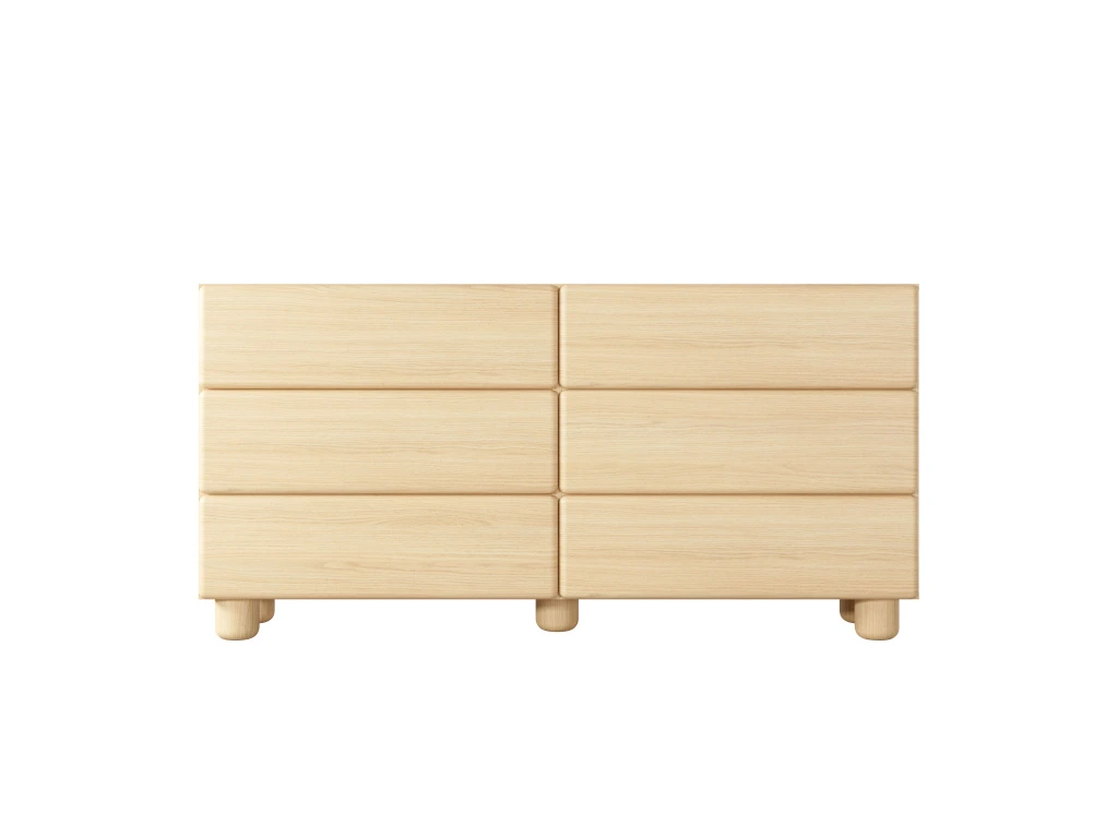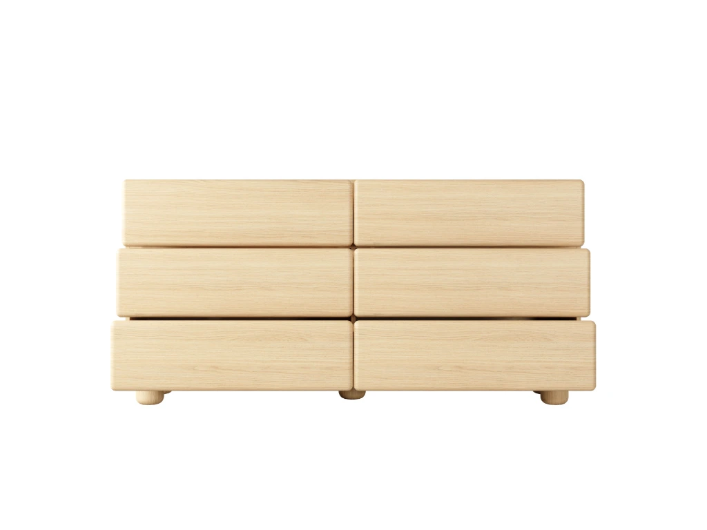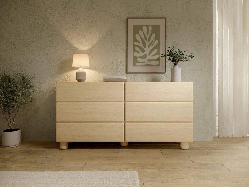 Komoda Lomo 6S nabízí šest zásuvek pro přehledné uspořádání všech drobností a zaujme čistým, harmonickým designem. Kolekce Lomo v sobě spojuje minimalistické tvary s jemně zaoblenými liniemi a teplým dekorem světlého dřeva dub Vicenza. Výrazným prvkem jsou zaoblené hrany a masivní válcovité nohy, které dodávají nábytku osobitý, téměř sochařský charakter. Díky absenci úchytek a systému push-to-open vyniká čistý design a celek působí klidně, harmonicky a přirozeně v každém interiéru.