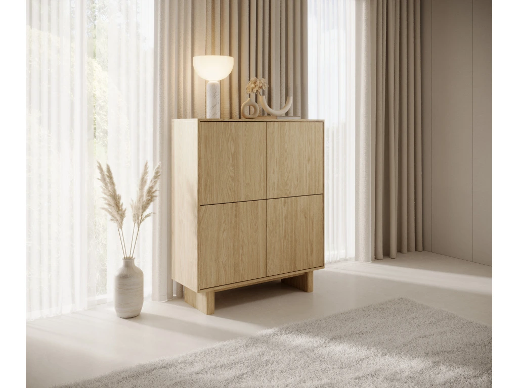 Komoda Nabu 4D nabízí čtyři dvířka s praktickým úložným prostorem a zaujme elegantním, harmonickým designem. Sektorový nábytek Nabu v dekoru olejovaného dubu spojuje přírodní vzhled s moderním designem a jemnými, zaoblenými liniemi. Minimalistické přední plochy bez úchytek s push-to-open systémem, kvalitní laminovaná dřevotříska doplněná o MDF lišty a kovové nebo ABS detaily zajišťují praktické a odolné řešení. Vitrína s tvrzeným sklem a LED osvětlením zvýrazní vystavené předměty a doplňky, zatímco konferenční stolky se zaoblenými rohy nabízejí variabilitu pro každý interiér. Celá kolekce působí harmonicky, elegantně a nadčasově.