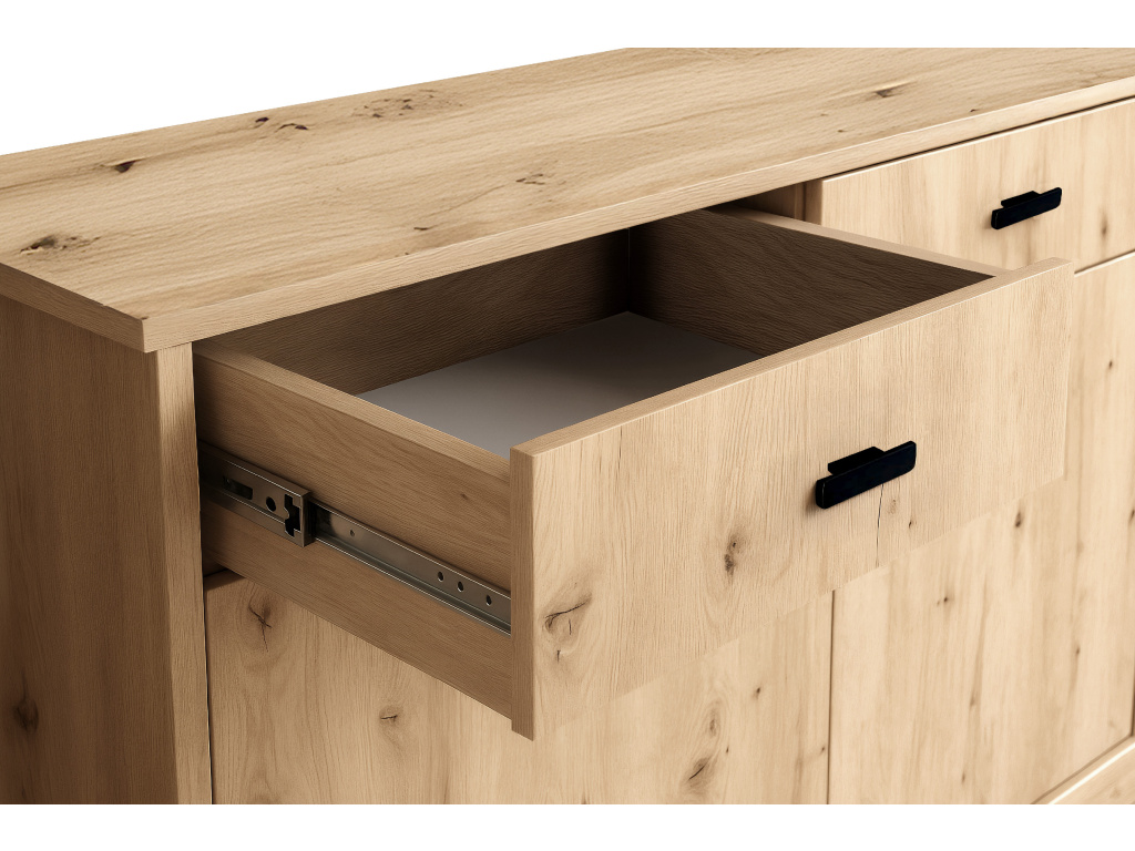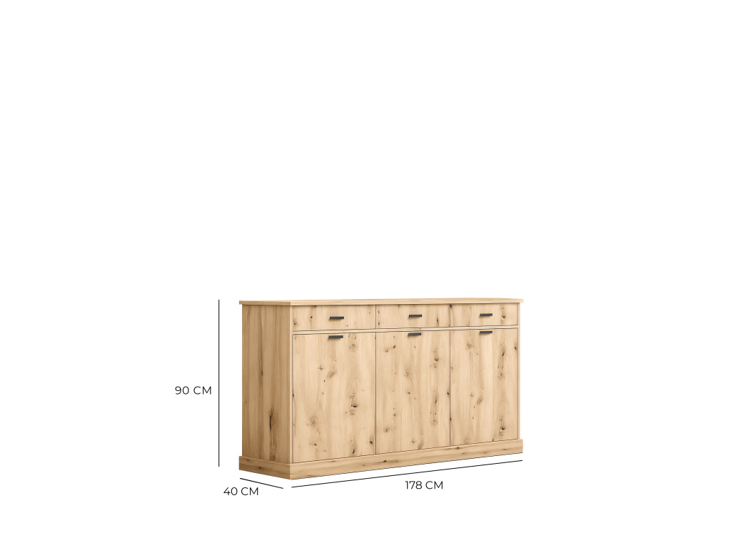 Komoda NISA v atraktivním provedení Dub Artisan je stylovým a praktickým doplňkem moderního interiéru, díky šířce 178 cm nabízí dostatek úložného prostoru v přehledně řešených zásuvkách, které usnadňují organizaci oblečení i drobností, nadčasový dekor dřeva dodává místnosti teplo a eleganci a rozměry 178 × 90 × 40 cm zajišťují ideální kombinaci kapacity a kompaktního provedení.