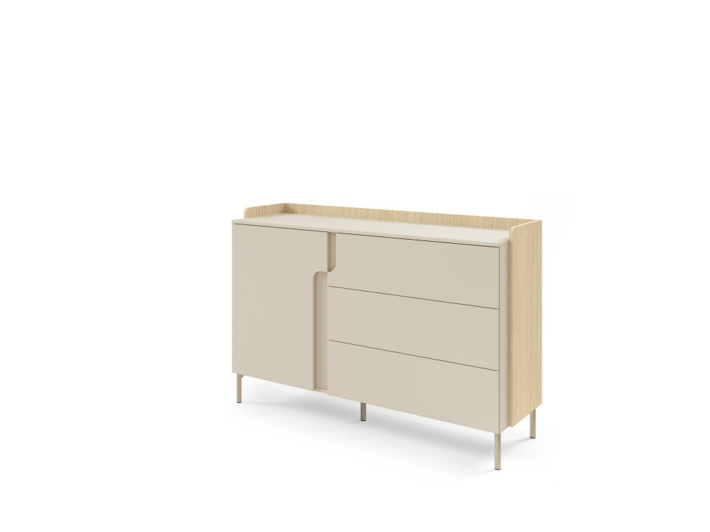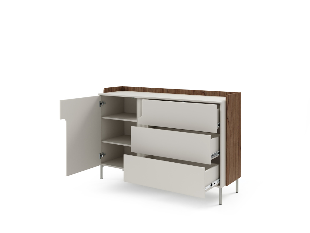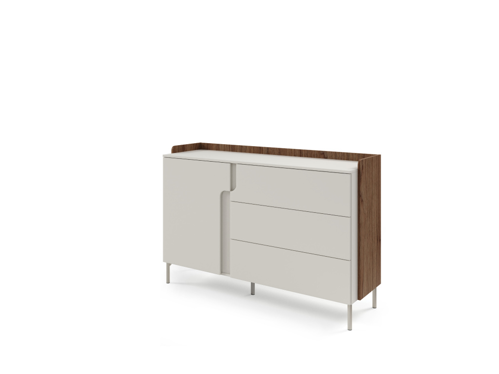 Komoda POSITANO se třemi šuplíky a jedněmi dvířky je praktickým a elegantním řešením pro moderní interiér, které nabízí ideální kombinaci přehledného úložného prostoru a nadčasového designu. Kvalitní ABS dýha zajišťuje vysokou odolnost proti poškrábání, snadnou údržbu a dlouhou životnost při každodenním používání. Zásuvky jsou ideální pro uložení drobností, zatímco uzavřený prostor za dvířky poskytuje místo pro větší předměty a pomáhá udržet místnost uklizenou. Díky čistým liniím a stabilní konstrukci se komoda hodí do obývacího pokoje, ložnice i pracovny a snadno se kombinuje s ostatním nábytkem kolekce POSITANO. Dostupné barevné kombinace: dub mavelie + makadamie, kašmír + ořech alba.