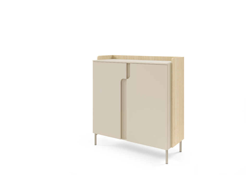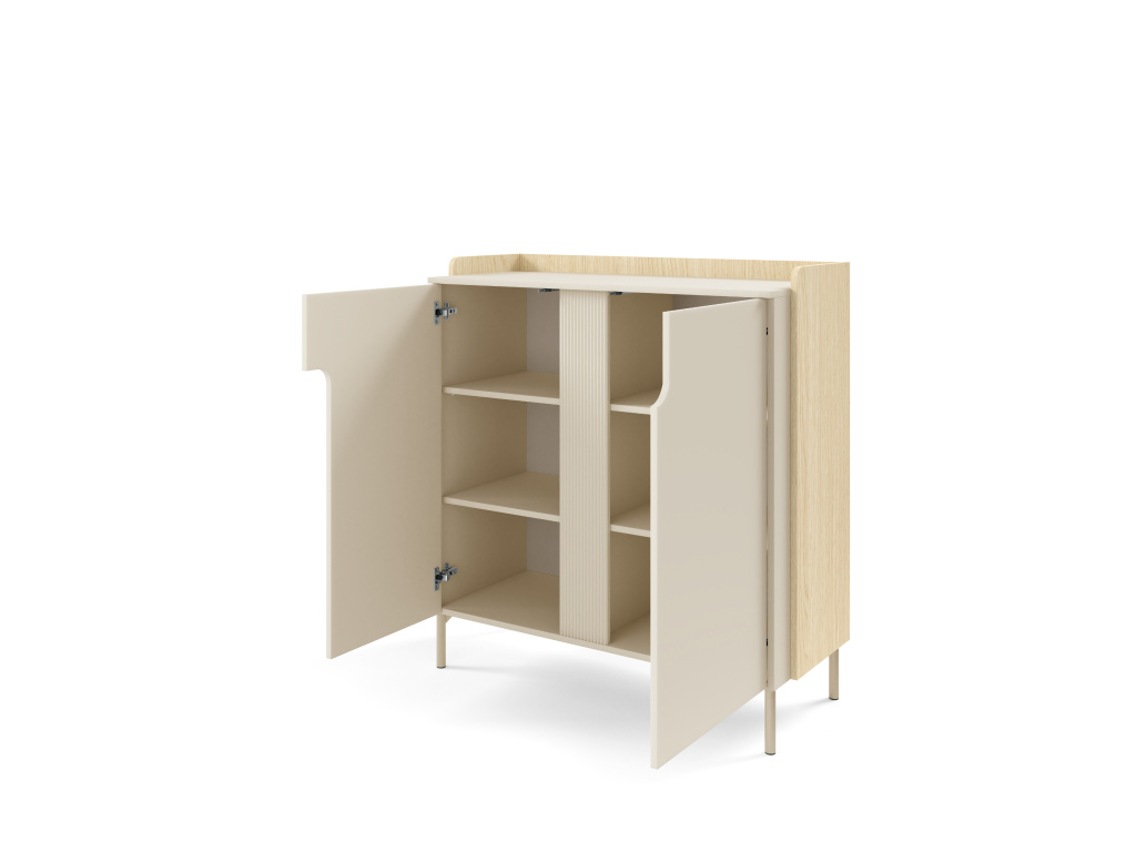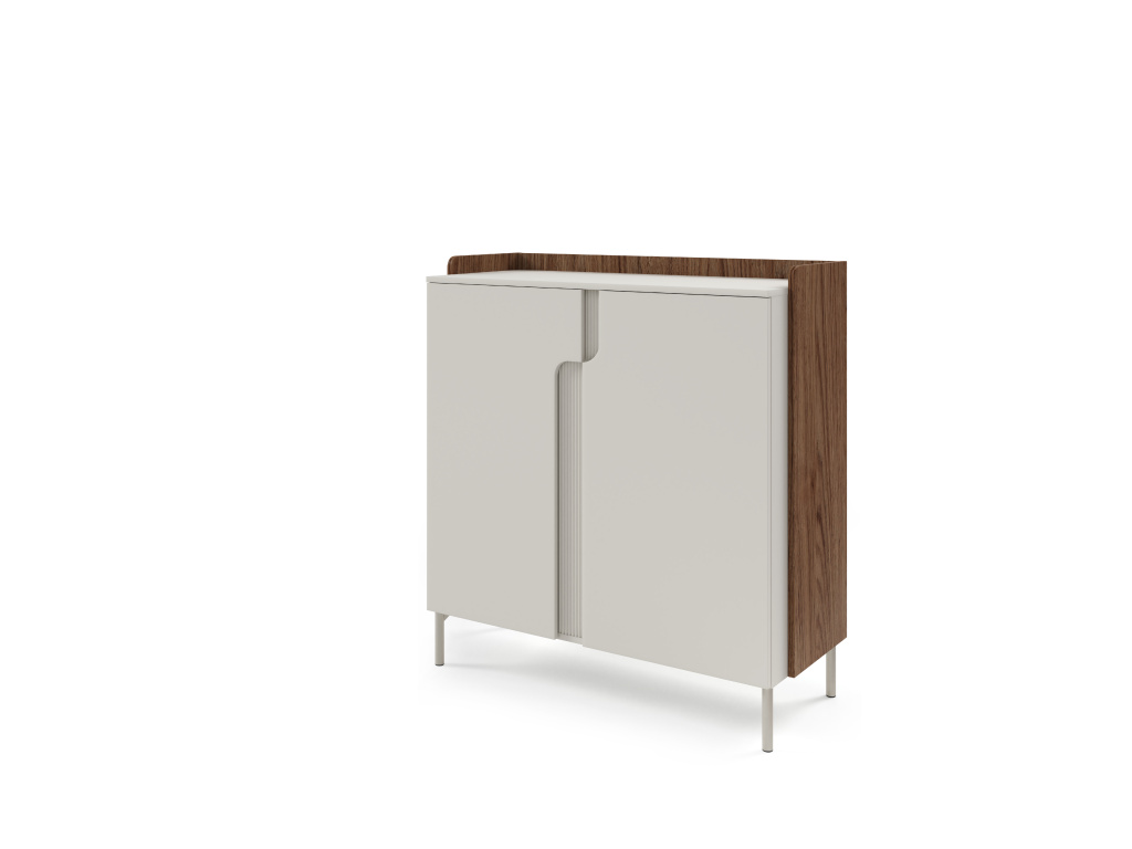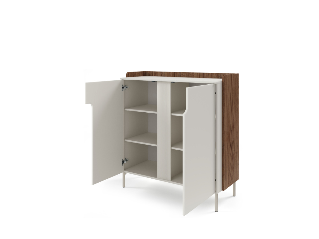 Komoda POSITANO se dvěma dvířky a policemi je praktickým a elegantním řešením pro moderní interiér, které nabízí dostatek úložného prostoru při zachování čistého a nadčasového vzhledu. Kvalitní ABS dýha zajišťuje vysokou odolnost proti poškrábání, snadnou údržbu a dlouhou životnost i při každodenním používání. Promyšlené vnitřní členění s policemi umožňuje přehledné uspořádání oblečení, dokumentů i doplňků, zatímco uzavřený prostor pomáhá udržet místnost vizuálně uklizenou. Díky moderním liniím a stabilní konstrukci se komoda hodí do obývacího pokoje, ložnice i pracovny a snadno se kombinuje s ostatním nábytkem kolekce POSITANO. Dostupné barevné kombinace: dub mavelie + makadamie, kašmír + ořech alba.