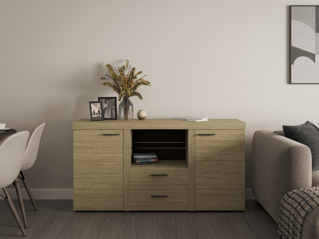 Dodejte vašemu obývacímu pokoji eleganci a praktičnost s komodou RUMBA. Tento model je navržen tak, aby nejen vyplnil prostor, ale také zvýšil jeho estetickou hodnotu. Komoda se může pochlubit solidní konstrukcí, která zahrnuje dvě uzavřené části, dvě zásuvky a skleněnou polici, což usnadňuje organizaci oblečení i vystavení rodinných památek nebo dekorací. Vyrobená z odolné laminované desky, která je rezistentní vůči mechanickému poškození. Subtilní úchyty dodávají komodě atraktivitu a zdůrazňují její charakteristický styl. Klíčové vlastnosti: vysoce kvalitní provedení, moderní design, LED osvětlení není součástí balení, produkty jsou nové a originálně zabalené, nábytek je určen pro samostatnou montáž, součástí balení jsou montážní prvky a návod, záruka 2 roky. Zvolte komodu RUMBA pro kombinaci stylu, funkčnosti a kvality ve vašem interiéru.Doplňkové parametry