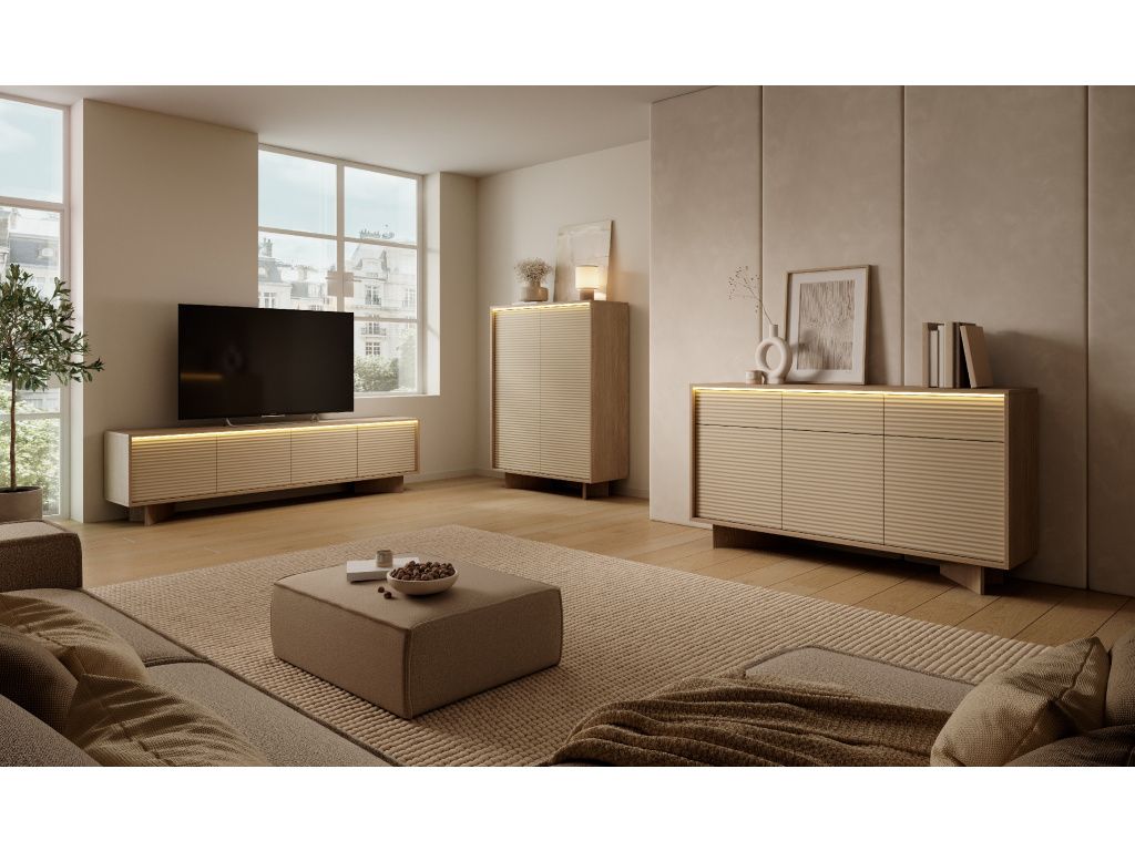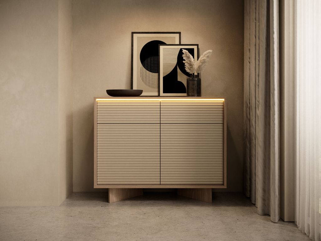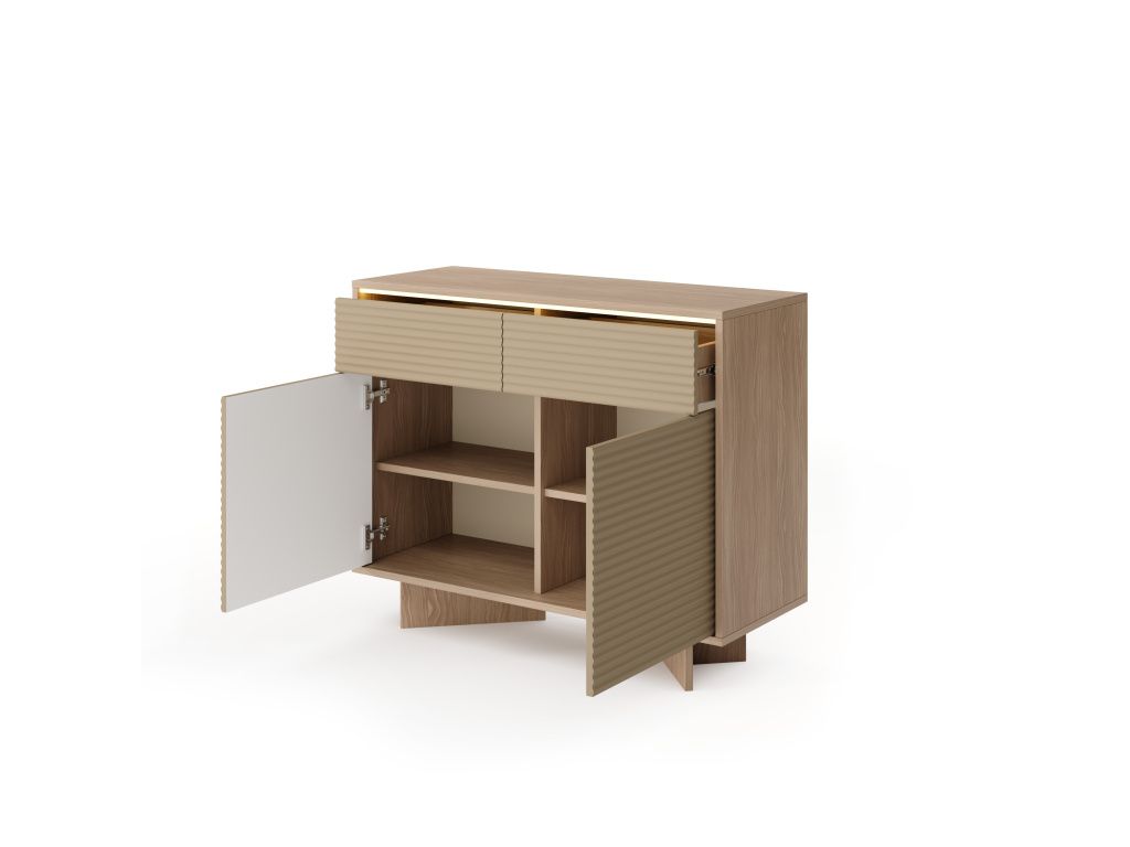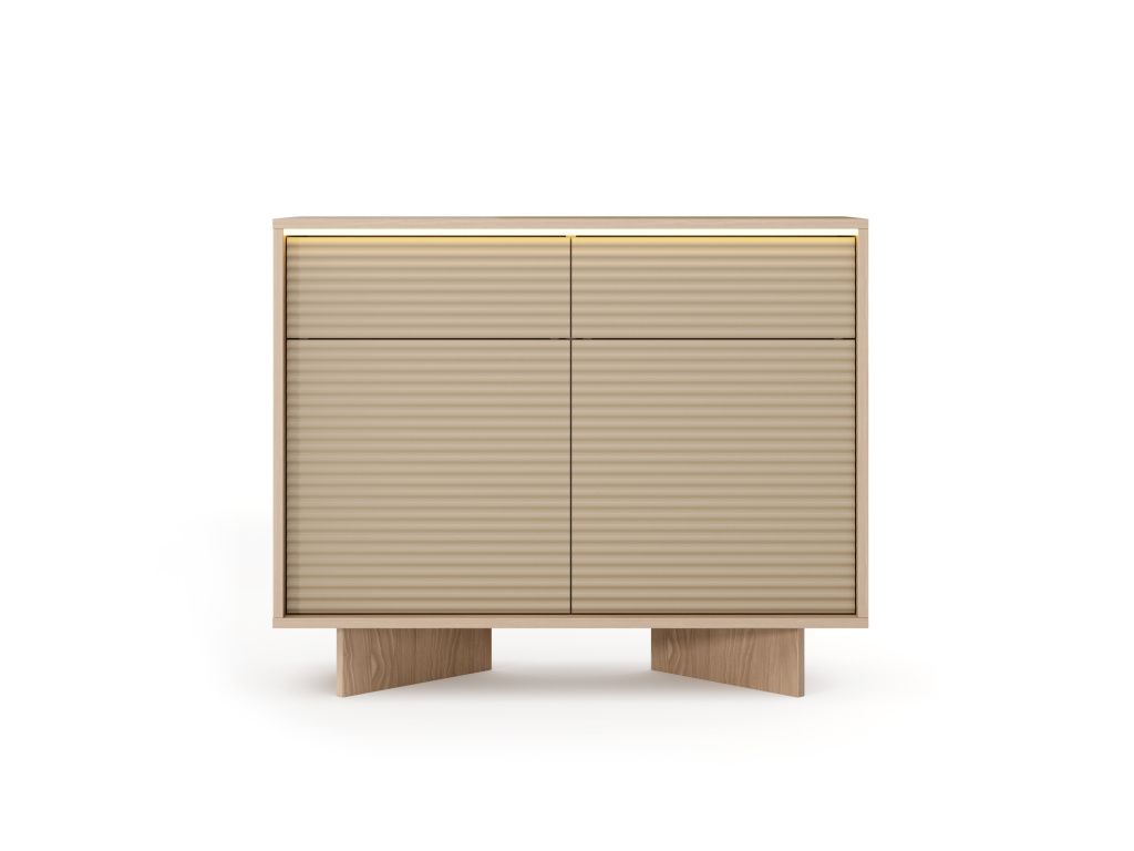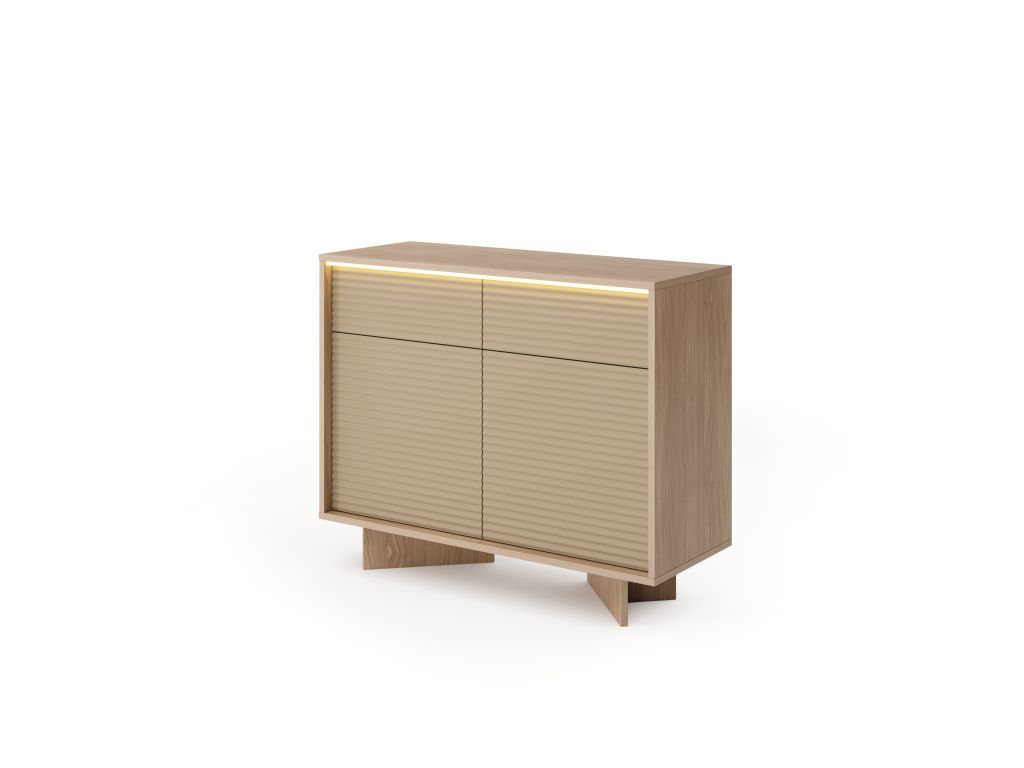 Komoda Semi 2D2S kombinuje uzavřený prostor za dvěma dvířky se dvěma zásuvkami a díky horizontálnímu rýhování a LED osvětlení nabízí praktický a elegantní doplněk interiéru. Sektorový nábytek Semi kombinuje moderní design s praktickými detaily a horizontálním rýhováním dvířek a zásuvek, které dodávají nábytku lehkost a originální vzhled. Teplé LED osvětlení ukryté pod horní deskou zvýrazňuje strukturu dřeva a vytváří příjemnou atmosféru v interiéru. Dvířka v módní barvě cappuccino skvěle kontrastují s korpusem z laminované desky v dekoru přírodní Bolivar, zatímco unikátní geometrická podstava podtrhuje současný a osobitý charakter celé kolekce. Celý nábytek působí harmonicky, elegantně a nadčasově.