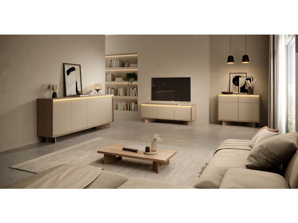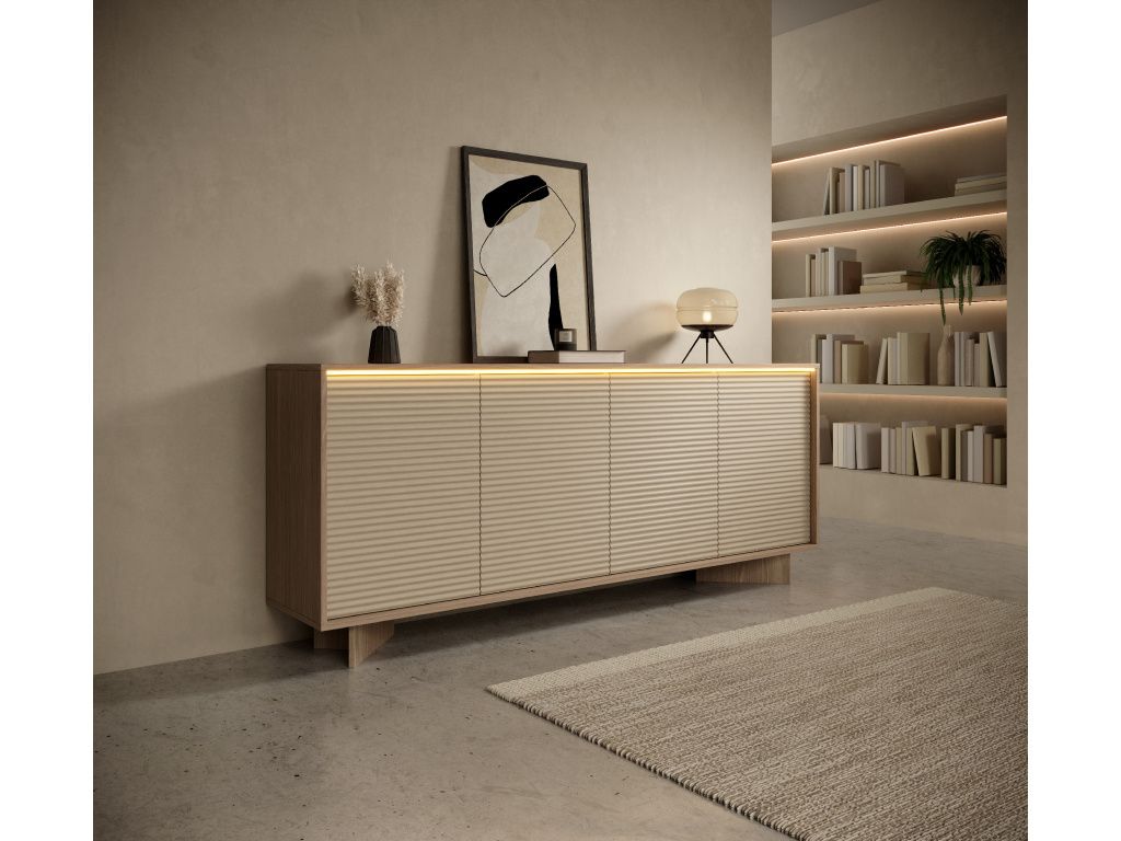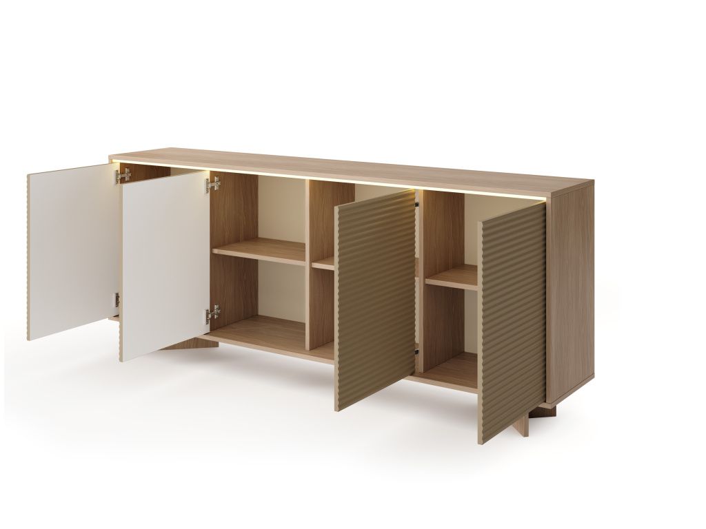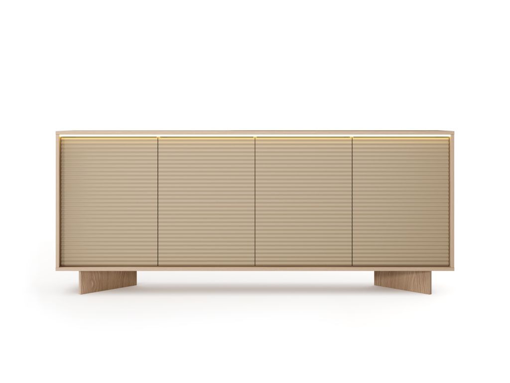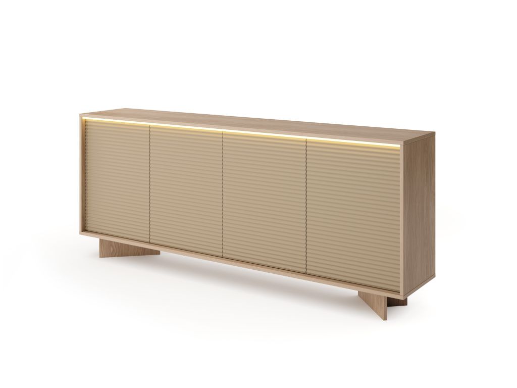 Komoda Semi 4D nabízí čtyři dvířka s praktickým úložným prostorem a díky elegantnímu designu s horizontálním rýhováním a LED osvětlením působí harmonicky a moderně. Sektorový nábytek Semi kombinuje moderní design s praktickými detaily a horizontálním rýhováním dvířek a zásuvek, které dodávají nábytku lehkost a originální vzhled. Teplé LED osvětlení ukryté pod horní deskou zvýrazňuje strukturu dřeva a vytváří příjemnou atmosféru v interiéru. Dvířka v módní barvě cappuccino skvěle kontrastují s korpusem z laminované desky v dekoru přírodní Bolivar, zatímco unikátní geometrická podstava podtrhuje současný a osobitý charakter celé kolekce. Celý nábytek působí harmonicky, elegantně a nadčasově.