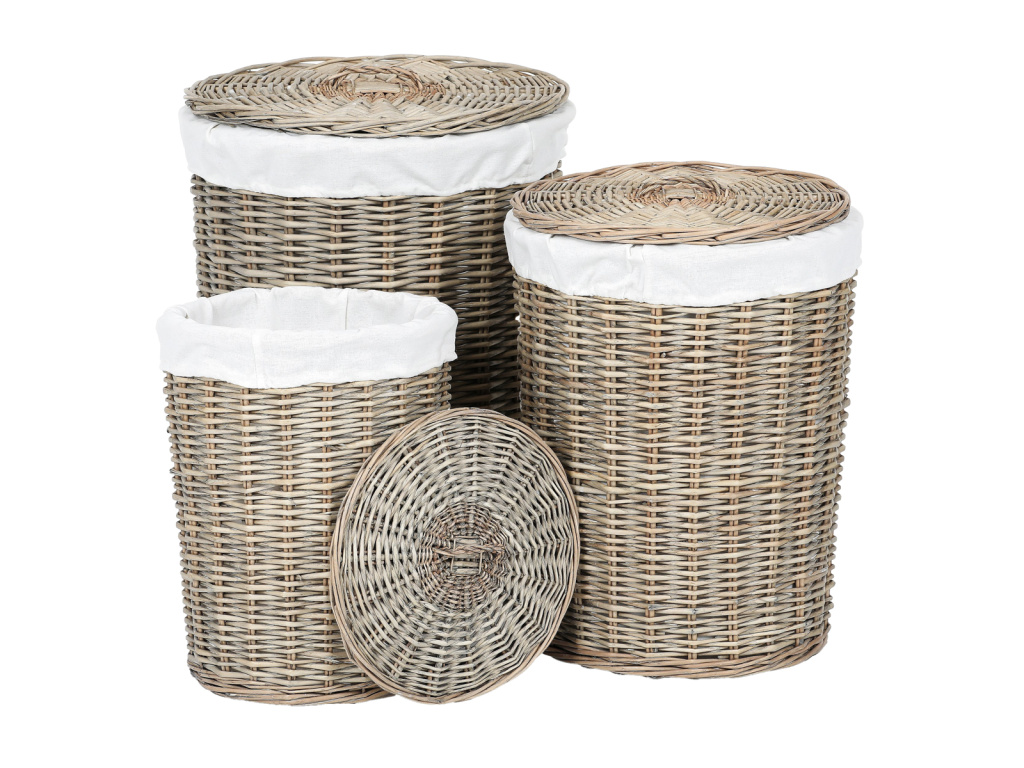 Získejte elegantní a praktické řešení pro sběr špinavého prádla, díky proutěným košům ve tvaru válce. Tato sada obsahuje 3 různě velké koše, každý s víkem a vnitřní výstelkou z látky, což zajišťuje lepší ochranu a diskrétnost obsahu. Barva proutí je šedá až béžová, což tyto koše činí univerzálními pro umístění v různých typech interiérů. Stylový proutěný design se snadno zaintegruje i do vaší domácnosti a zároveň poskytne efektivní řešení pro ukládání špinavého prádla. Udržujte svůj prostor uklizený a patřičně uspořádaný i za přispění těchto proutěných košů na prádlo.Doplňkové parametry