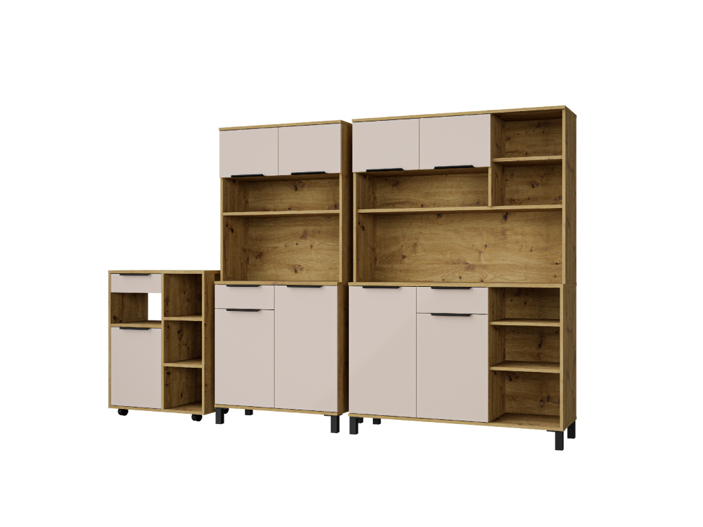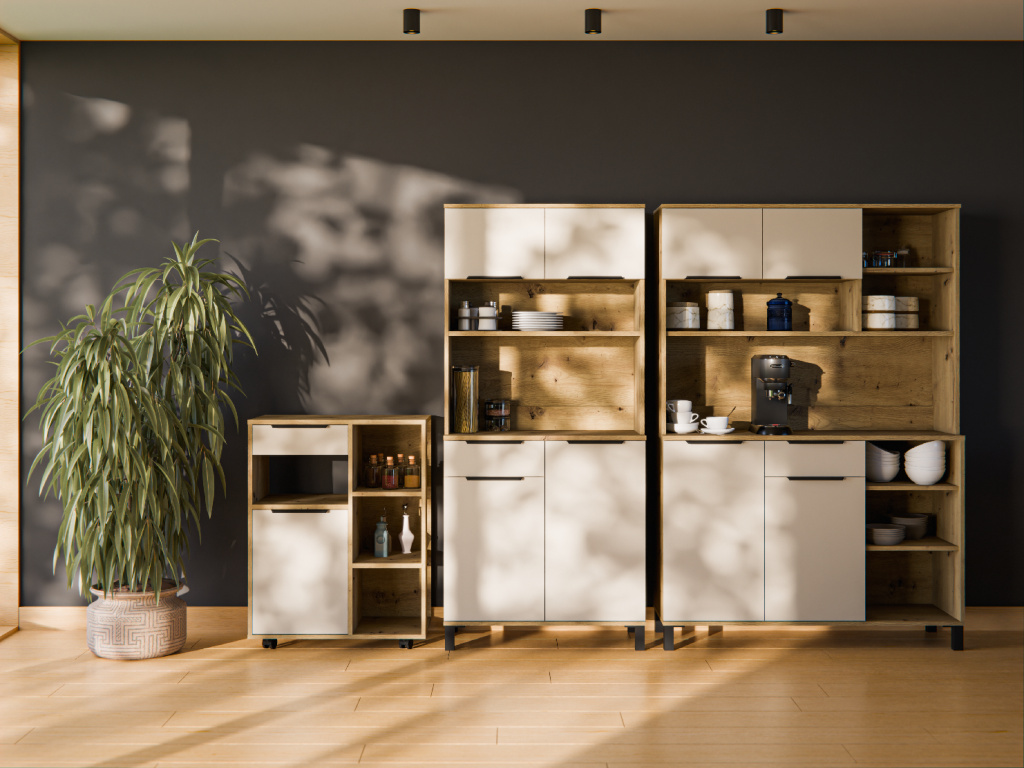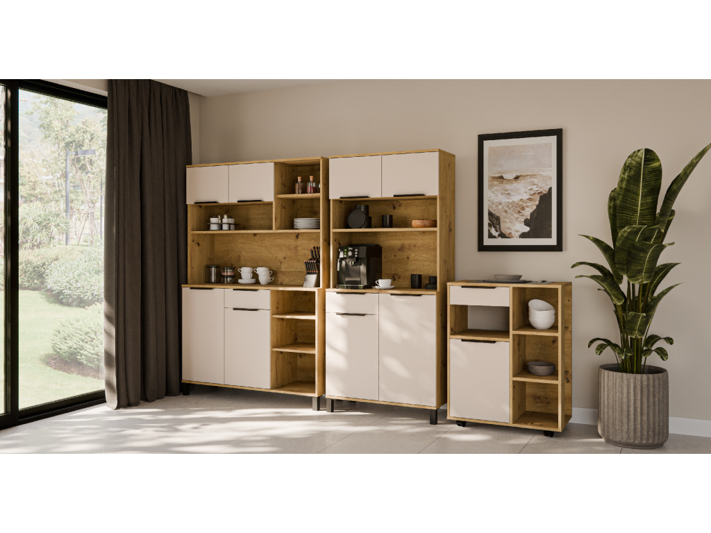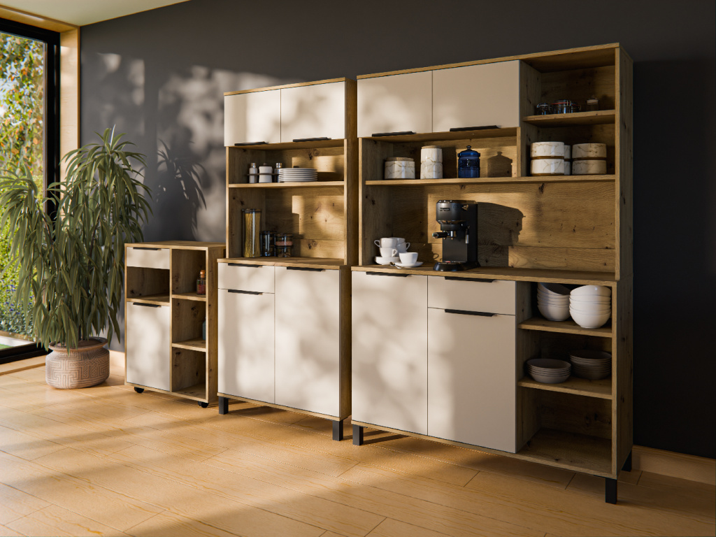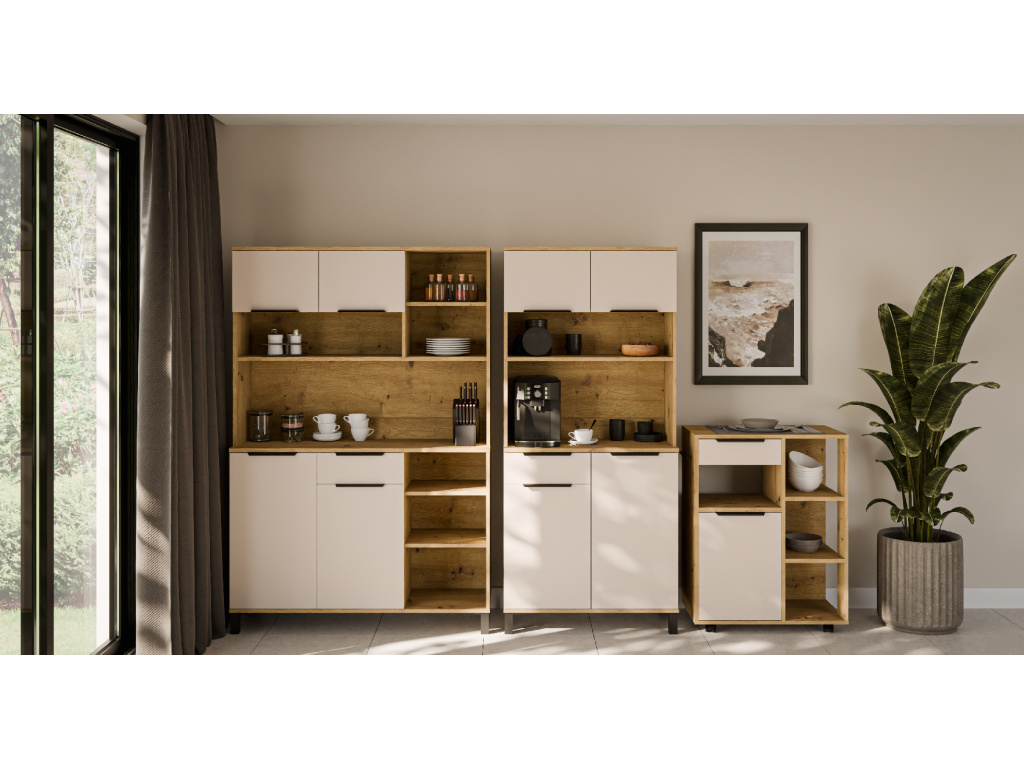 Kredenc Solea 120 z kolekce Solea nabízí praktický úložný prostor v elegantním a nadčasovém designu. Korpus z laminované desky o tloušťce 16 mm v dekoru dub artisan doplňuje zadní strana z bílé HDF desky, která zajišťuje pevnost a stabilitu nábytku. Dvířka a čela zásuvek v jemném kašmírovém odstínu jsou vyrobena z kvalitní laminované desky s odolnou ABS hranou. Kredenc poskytuje dostatek prostoru pro uložení nádobí i kuchyňských doplňků a je vybavena zásuvkami s výsuvným systémem PREMIUM BOX s plnovýsuvem, vysokou nosností a tichým dovíráním. Dvířka jsou rovněž osazena tlumeným zavíráním. Moderní vzhled dotvářejí černé hliníkové úchytky UA-HEXA s variabilní roztečí 64–320 mm. Kredenc Solea 120 lze snadno kombinovat s dalšími prvky kolekce Solea pro jednotný vzhled kuchyně.