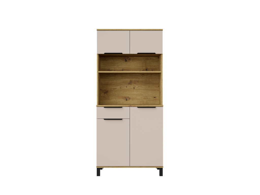 Kredenc Solea 80 z kolekce Solea nabízí praktický úložný prostor v elegantním a nadčasovém designu. Korpus z laminované desky o tloušťce 16 mm v dekoru dub artisan doplňuje zadní strana z bílé HDF desky, která zajišťuje pevnost a stabilitu nábytku. Dvířka a čela zásuvek v jemném kašmírovém odstínu jsou vyrobena z kvalitní laminované desky s odolnou ABS hranou. Kredenc poskytuje dostatek prostoru pro uložení nádobí i kuchyňských doplňků a je vybavena zásuvkami s výsuvným systémem PREMIUM BOX s plnovýsuvem, vysokou nosností a tichým dovíráním. Dvířka jsou rovněž osazena tlumeným zavíráním. Moderní vzhled dotvářejí černé hliníkové úchytky UA-HEXA s variabilní roztečí 64–320 mm. Kredenc Solea 80 lze snadno kombinovat s dalšími prvky kolekce Solea pro jednotný vzhled kuchyně.