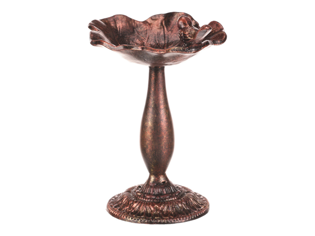 Toto kovové pítko pro ptáčky v měděné barvě je nejen praktické, ale jedná se také o krásné zahradní doplnění. Miska na podstavci je zdobena malým pěvcem, který dodává pítku jemný detail. Stabilita této dekorace je zajištěna její hmotností a těžištěm ve spodní části. Perfektní pro umístění na zahradu, terasu, případně balkón, kde svým provedením bude dělat radost vám i všem ptáčkům, kteří na zahradu zavítají.Doplňkové parametry