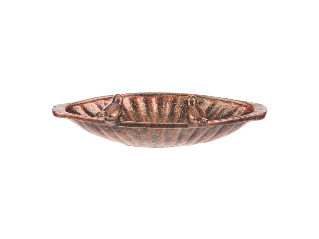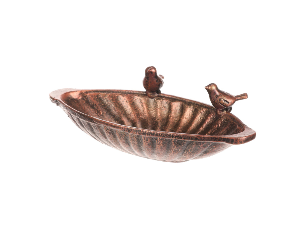 Kovové krmítko/pítko v měděné barvě ve tvaru listu je dokonalou dekorací pro vaši zahradu nebo terasu. Okraje zdobí dva drobní pěvci, kteří přidávají jemný přírodní nádech. Ideální na položení na okenní parapet nebo jiné vyvýšené místo, kde potěší nejen vás, ale i vaše opeřené návštěvníky.Doplňkové parametry