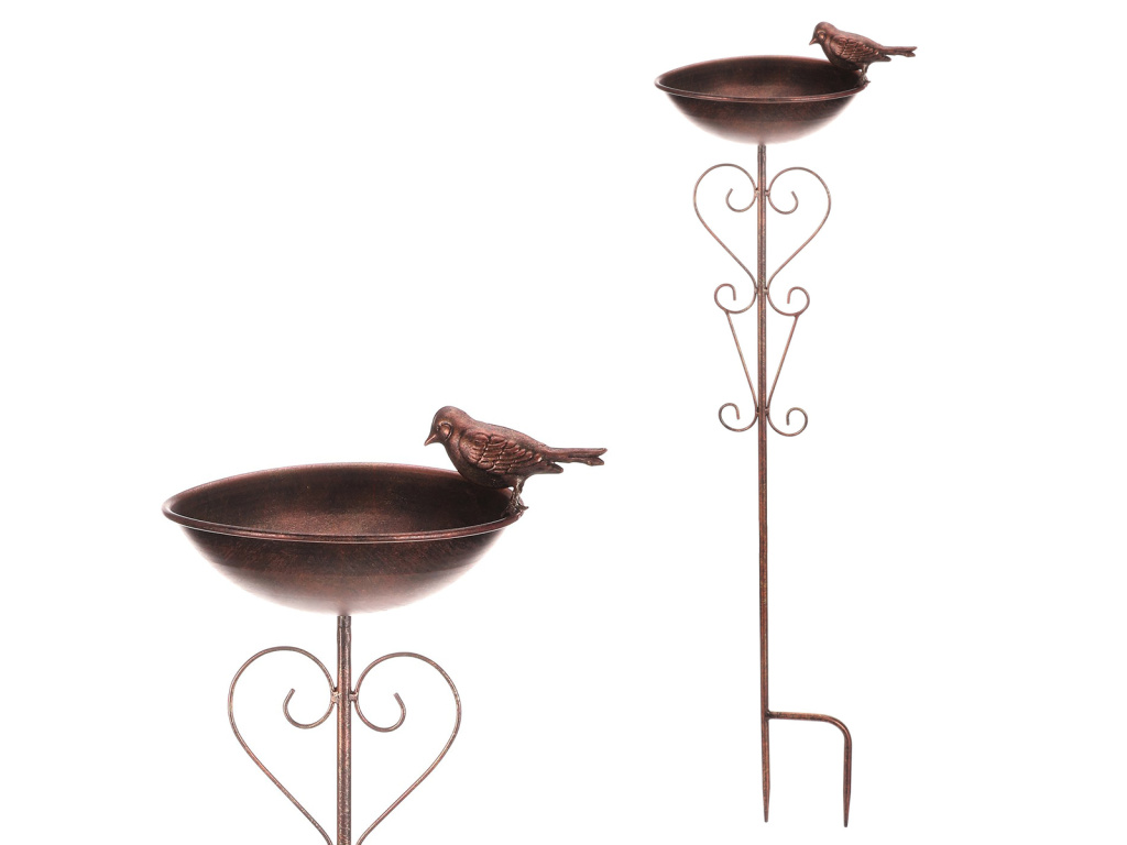 Kovové krmítko/pítko v měděné barvě je praktickým i dekorativním doplňkem pro vaši zahradu. Miska umístěná navrchu je ozdobena jedním drobným pěvcem, který přidává jemný přírodní prvek. Díky zápichu ho snadno umístíte do záhonu, truhlíku nebo přímo do země, kde se stane ozdobou pro vás a vděčnou občerstvovací stanicí pro opeřené návštěvníky.Doplňkové parametry