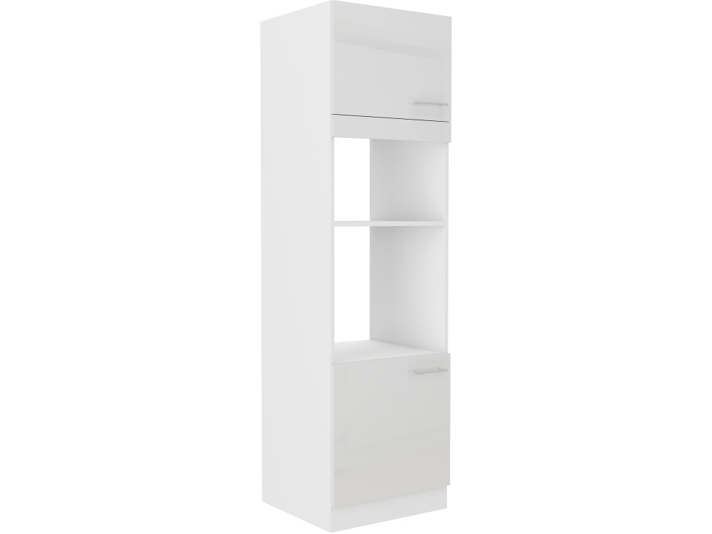 Vysoká kuchyňská skříňka z kolekce LARA s výškou 210 cm a dvěma dvířky je určena pro vestavbu spotřebičů, jako je mikrovlnná trouba a kávovar. Díky svému praktickému členění umožňuje elegantní a pohodlné začlenění těchto spotřebičů do kuchyňské linky, a zároveň nabízí uzavřený úložný prostor v horní i spodní části skříňky. Čela jsou vyrobena z kvalitního materiálu s odolnou ABS hranou a dostupná ve třech moderních lesklých variantách – cappuccino, šedý a bílý lesk. Bílý laminovaný korpus zajišťuje dlouhou životnost a snadnou údržbu. Dvířka jsou osazena panty s tlumeným dovíráním pro tiché a plynulé zavírání. Kovové úchytky v lesklém chromu s roztečí 128 mm dotvářejí moderní a čistý vzhled celé kuchyňské sestavy. Tento model je ideální pro ty, kteří chtějí mít své spotřebiče stylově zabudované a snadno přístupné.