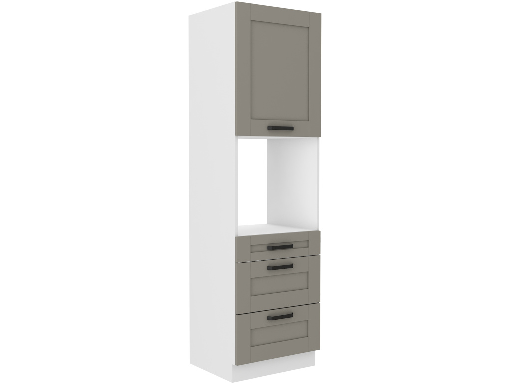 Vysoká kuchyňská skříňka Luna o šířce 60 cm a výšce 210 cm v provedení PREMIUM BOX je určena pro vestavbu trouby a zároveň nabízí tři prostorné zásuvky a horní skříňku s dvířky. Spojuje moderní design s maximální funkčností a je ideální pro přehledné uspořádání kuchyňských potřeb. Korpus je vyroben z laminované desky o tloušťce 16 mm v odstínu dub artisan nebo bílá, zadní strana je z bílé HDF desky. Čela zásuvek a dvířka z 19mm MDF desky jsou dostupná v barvách hliněně šedá, prachově šedá a bílá. Skříňka je vybavena čtyřmi černými kovovými úchytkami (rozteč 160 mm) a systémem tichého dovírání pro plynulý a tichý provoz. Zásuvky PREMIUM BOX zajišťují vysoký komfort používání a dostatek prostoru pro uložení veškerého náčiní i kuchyňských pomůcek.