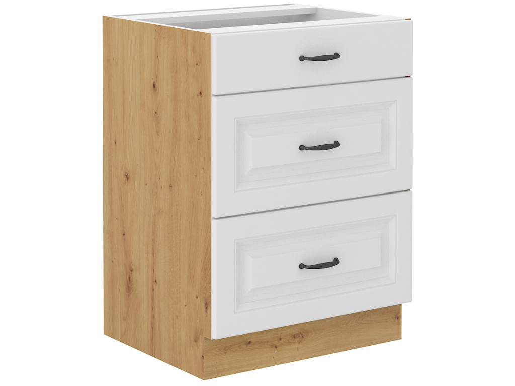 Dolní skříňka STILO s třemi šuplíky a tichým pojezdem PREMIO BOX je ideálním řešením pro každou moderní kuchyni, která hledá spojení stylu a funkčnosti. Dvířka skříňky, vyrobená z kvalitní MDF desky o tloušťce 16 mm, jsou k dispozici v elegantních barevných variantách: clay grey, dust grey, grafit a bílá. Tyto barevné možnosti umožňují snadné sladění skříňky s jakýmkoli interiérem. Korpus skříňky je vyroben z 16mm desky a je dostupný v atraktivních dekorech Dub Artisan a bílá, což přidává vaší kuchyni přirozený a moderní vzhled. Kovový úchyt s roztečí 96 mm zaručuje pohodlné a snadné otevírání, zatímco moderní design skříňky přináší do vašeho domova aktuální trendy. Díky třem prostorným šuplíkům s tichým pojezdem PREMIO BOX nabízí dolní skříňka STILO dostatek úložného prostoru pro všechny vaše kuchyňské potřeby a zvyšuje komfort užívání. Vyberte si skříňku STILO pro svou kuchyni a užijte si perfektní kombinaci kvality, estetiky a praktičnosti, která zlepší vzhled i funkčnost vašeho prostoru.Doplňkové parametry