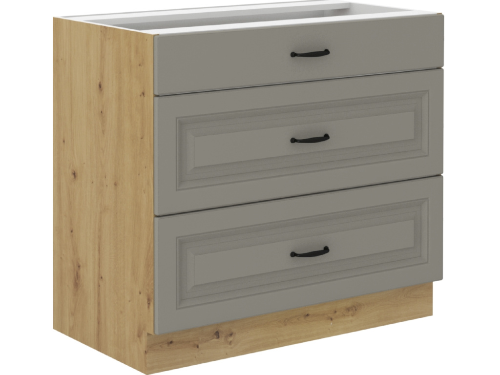 Dolní skříňka STILO s třemi šuplíky a tichým pojezdem PREMIO BOX je vynikajícím řešením pro moderní kuchyně, které vyžadují spojení elegance a vysoké funkčnosti. Dvířka skříňky jsou vyrobena z kvalitní MDF desky o tloušťce 16 mm a nabízejí se v několika sofistikovaných barevných variantách: clay grey, dust grey, grafit a bílá. Tyto varianty umožňují snadné začlenění skříňky do jakéhokoliv kuchyňského interiéru. Korpus skříňky je vyroben z 16mm desky a je k dispozici v barvách Dub Artisan a bílá, což přidává skříňce přirozený a moderní vzhled. Kovový úchyt s roztečí 96 mm zajišťuje pohodlné a snadné otevírání, zatímco moderní design skříňky dodává vaší kuchyni trendový a stylový vzhled. Díky třem šuplíkům s tichým pojezdem PREMIO BOX nabízí dolní skříňka STILO dostatek úložného prostoru pro vaše kuchyňské potřeby, přičemž zvyšuje komfort a uživatelskou přívětivost. Zvolte skříňku STILO pro vaše kuchyňské řešení a užijte si spojení kvality, estetiky a praktičnosti, které vylepší vzhled i funkčnost vaší kuchyně.Doplňkové parametry