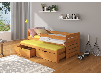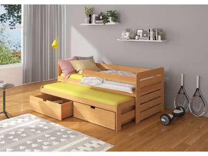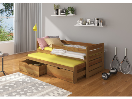 Manželská postel Tomi se zábranou je ideálním řešením do pokoje dvou sourozenců. Je také ideální pro nečekané hosty. Model je k dispozici ve dvou velikostech a mnoha barvách, aby se hodil k jakémukoli uspořádání. Postel má dvě praktické a funkční přihrádky na lůžkoviny a odolný a pevný rám z borovicového dřeva. Pro zvýšení bezpečnosti vašeho dítěte byl model doplněn o další zábranu chránící před pádem. Matrace nejsou součástí sady.