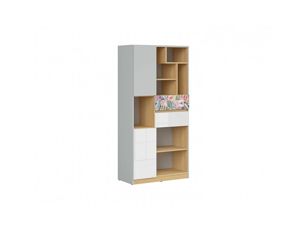 NANDU regál REG2D2S, šedá/dub polský/bílý lesk/nálepka