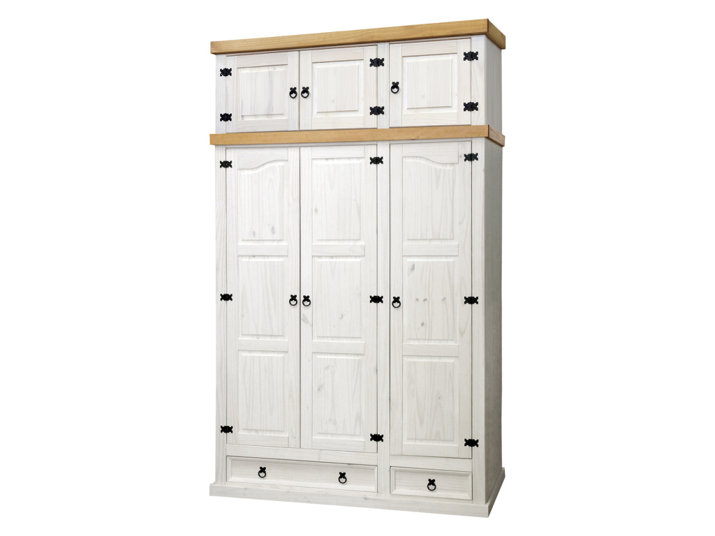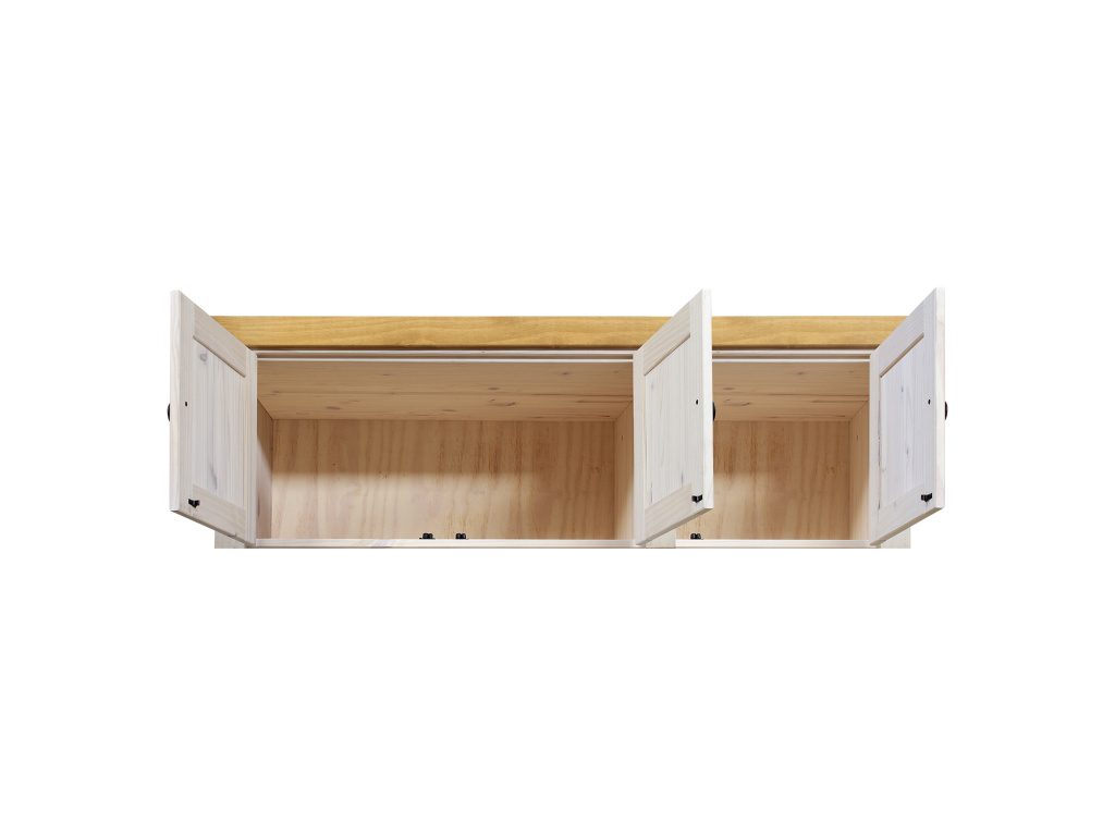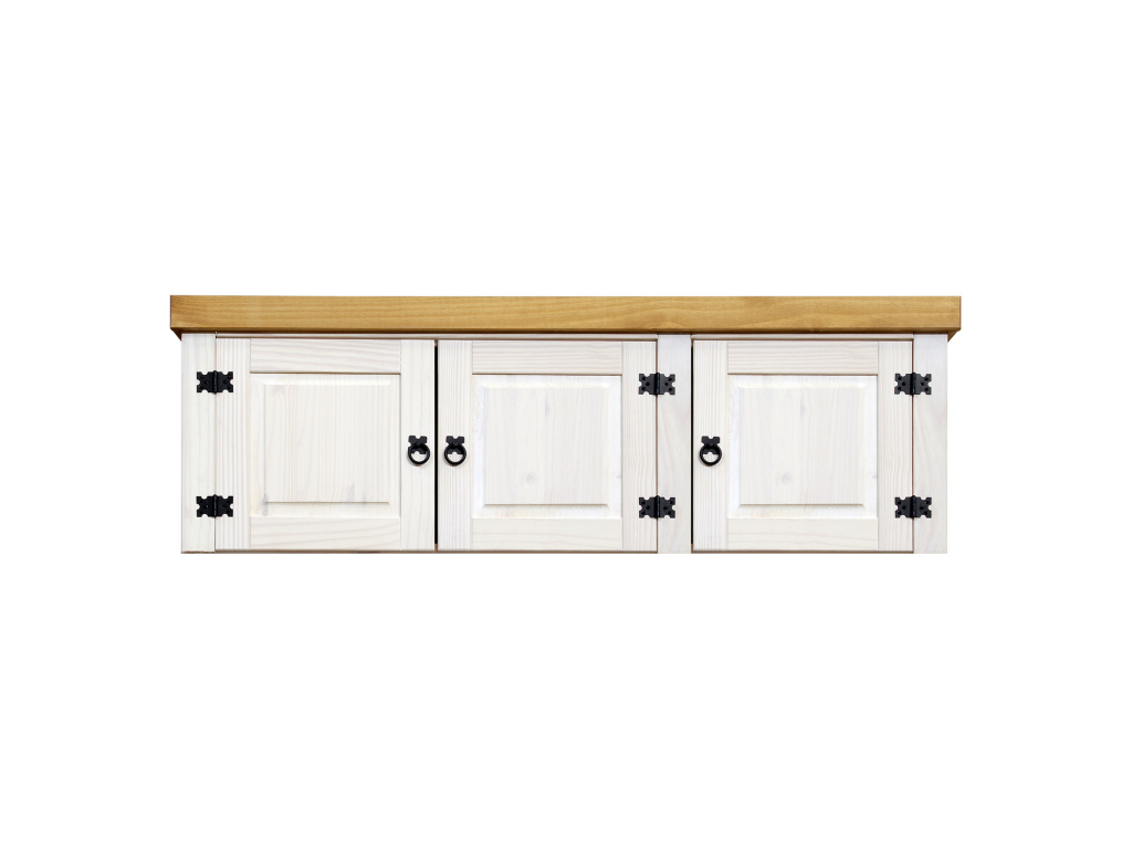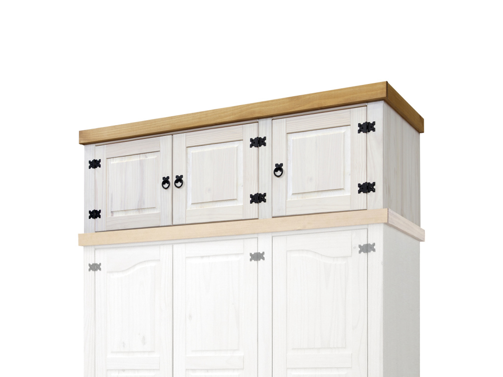 Nástavec 3dveřový CORONA bílý vosk je úchvatným a funkčním doplňkem pro váš domov, který úspěšně kombinuje estetiku a praktičnost. Vyhotoven z vysoce kvalitního masivu borovice, tento nástavec je ošetřen voskem v bílém odstínu, zatímco horní lem zůstává ve voskovaném medovém odstínu, což celému kusu nábytku dodává jedinečný a teplý vzhled. Nástavec je navržený specificky pro skříň s kódem 162818B a je součástí oblíbené sestavy Corona bílá, což z něj činí ideální rozšíření pro vaše stávající úložné prostory.